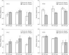 图3 聚乙烯颗粒各个窄粒径段的整体圆形度和静电分选正负荷电颗粒的SEM图像