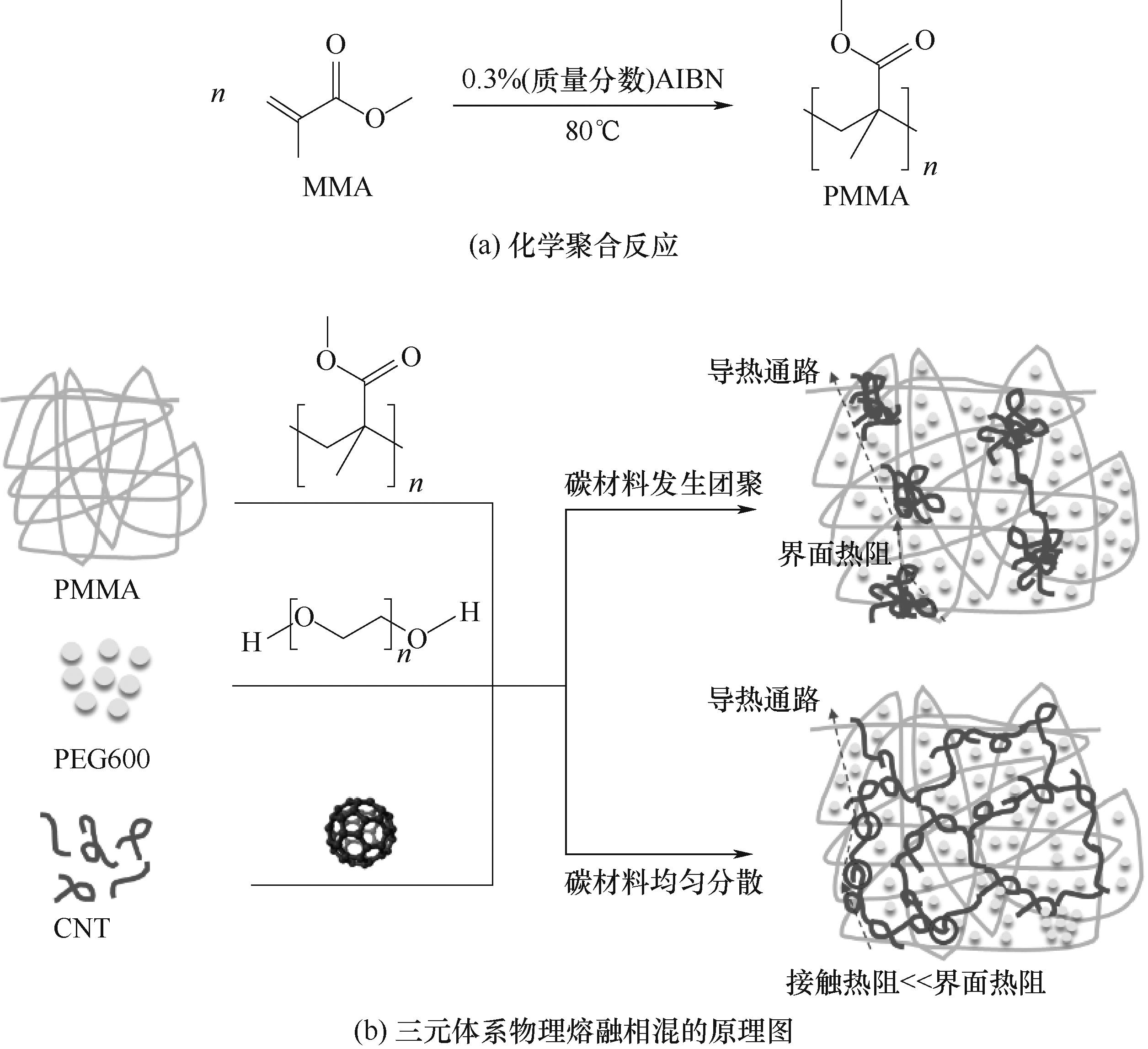 图2 基于原位聚合法制备PMMA/PEG600/CNT的化学和物理反应过程示意图