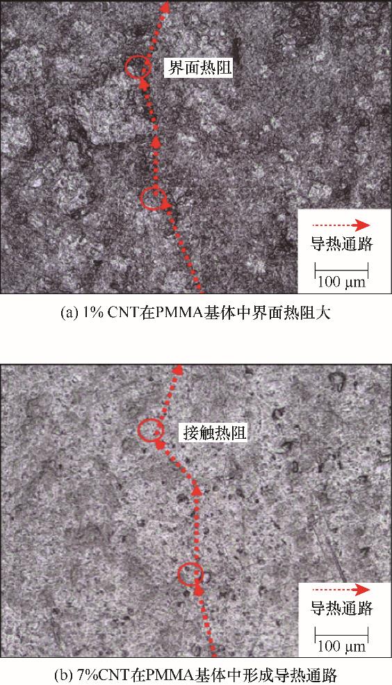 针对固-液相变复合材料由于碳材料分布不均引起的热导率低的问题,采用原位聚合法并结合官能化表面改性方式优化体系中CNT的分散,提出甲基丙烯酸甲酯聚合物(PMMA)/聚乙二醇(PEG600)/碳纳米管(CNT)的导热增强型复合相变材料。首先,确定以PMMA为基底封装相变材料PEG600的最佳质量配比为3∶7,此时材料兼具良好的封装性能和蓄热性能。其次,利用原位聚合法利于调控体系黏度的特性,在PMMA/PEG600体系中最大程度引入CNT至浓度阈值,极大提升了复合材料热导率。当CNT质量分数为7%时,复合材料的热导率为0.438 W/(m·K),约为未添加CNT时的3倍。最后,针对CNT进行羟基官能化表面改性进一步强化导热性能。当羟基化CNT质量分数为3%时,含CNT和羟基化CNT的三元复合材料较二元复合材料的热导率分别提升了8%和92%。