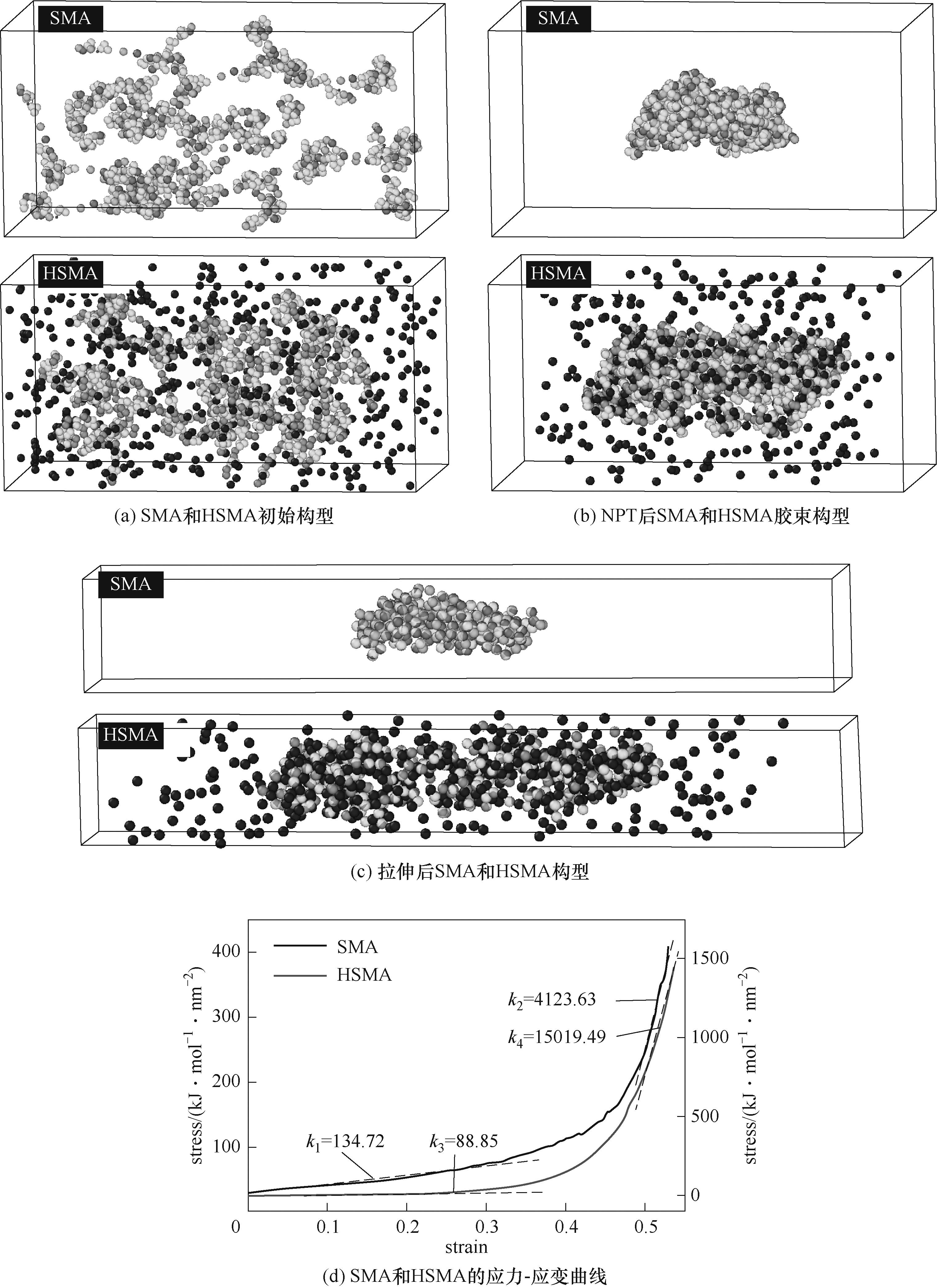图1 基于Martini力场体系的纳米颗粒、水、SMA、HSMA、NH4+、防冻水的粗粒化计算模型