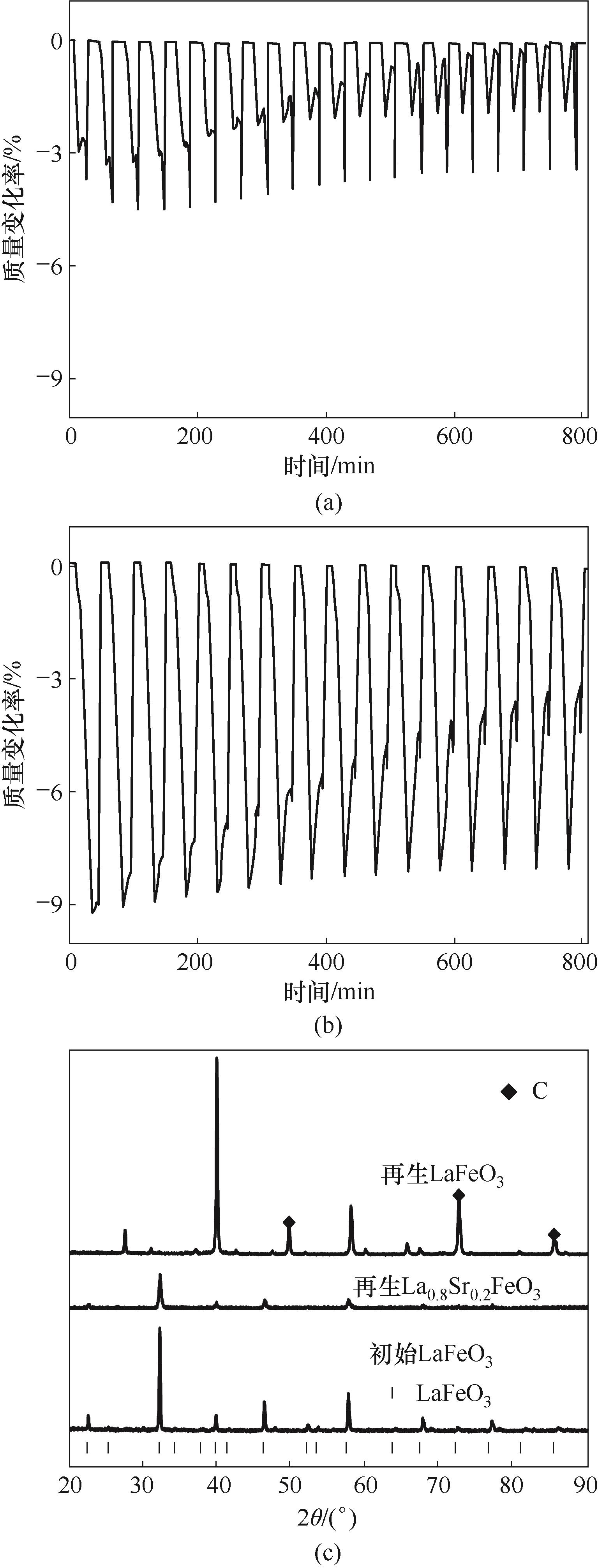 Fig.11 (a) Mass change of LaFeO3 during CH4 reduction-air oxidation process;(b) Mass change of La0.8Sr0.2FeO3 during CH4 reduction-air oxidation process; (c) XRD patterns comparison of regenerated and fresh oxygen carrier
