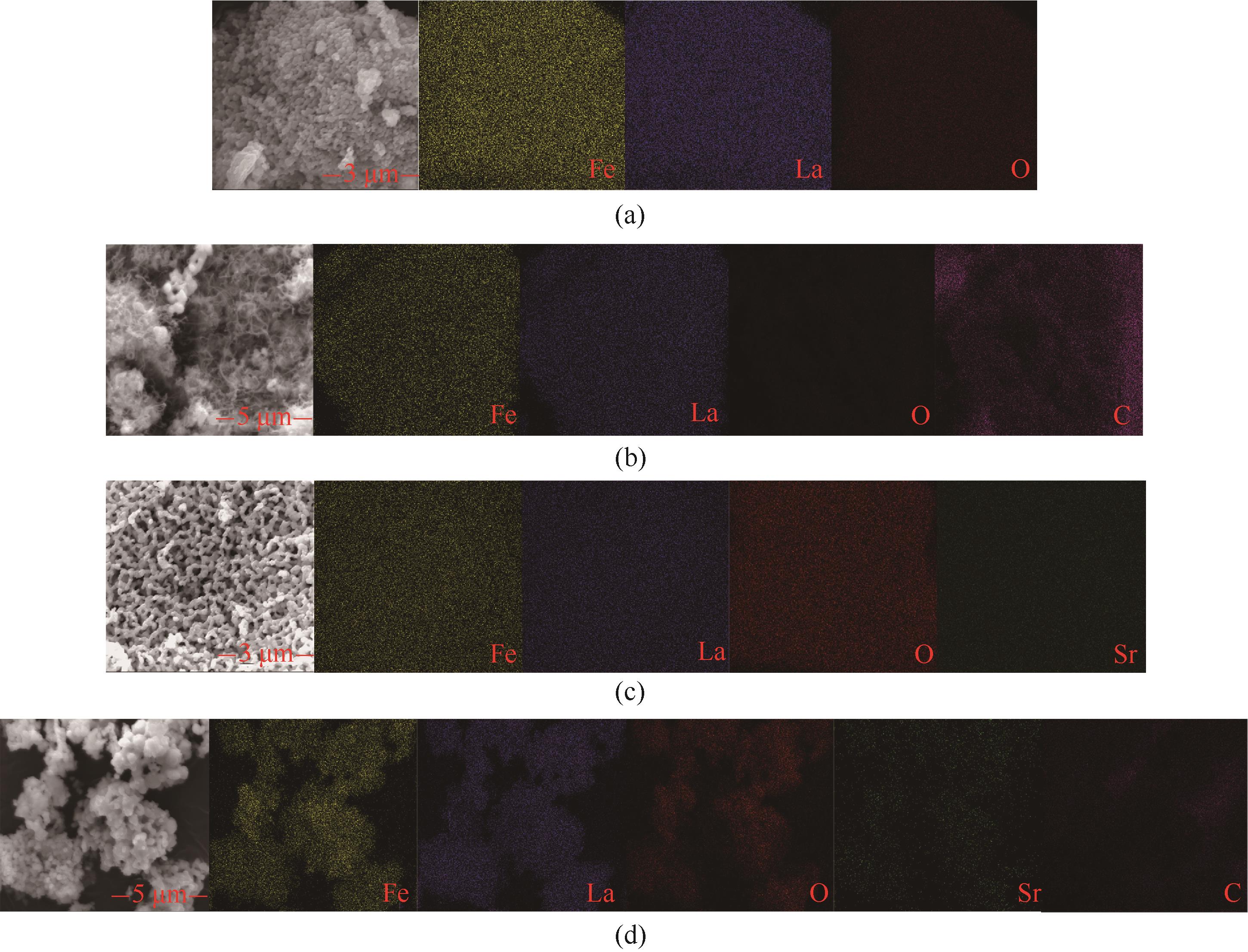图12 初始的LaFeO3(a)、20周期后的LaFeO3(b)、初始的La0.8Sr0.2FeO3(c)和20周期后的La0.8Sr0.2FeO3(d)的SEM-Mapping谱图