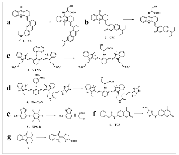 Fig.5 Modification reactions of free cysteine: (a) and (b) haloalkylation reactions; (c) and (d) sulphur exchange reactions; (e) and (f) form a five-membered ring reaction; (g) substitution reactions