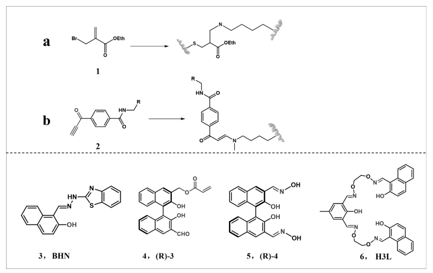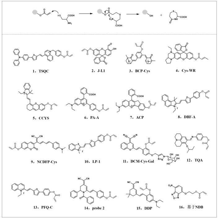 图6 丙烯酸酯的特殊不饱和键与巯基反应示意图和相应的探针结构