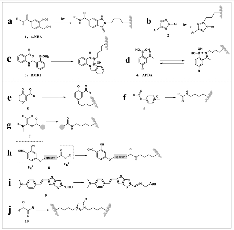 图7 与赖氨酸残基的环化反应及与醛或酯的反应:(a)、(b)、(c)和(d)环化反应;(e)、(f)、(g)、(h)、(i)和(j)醛或酯的反应