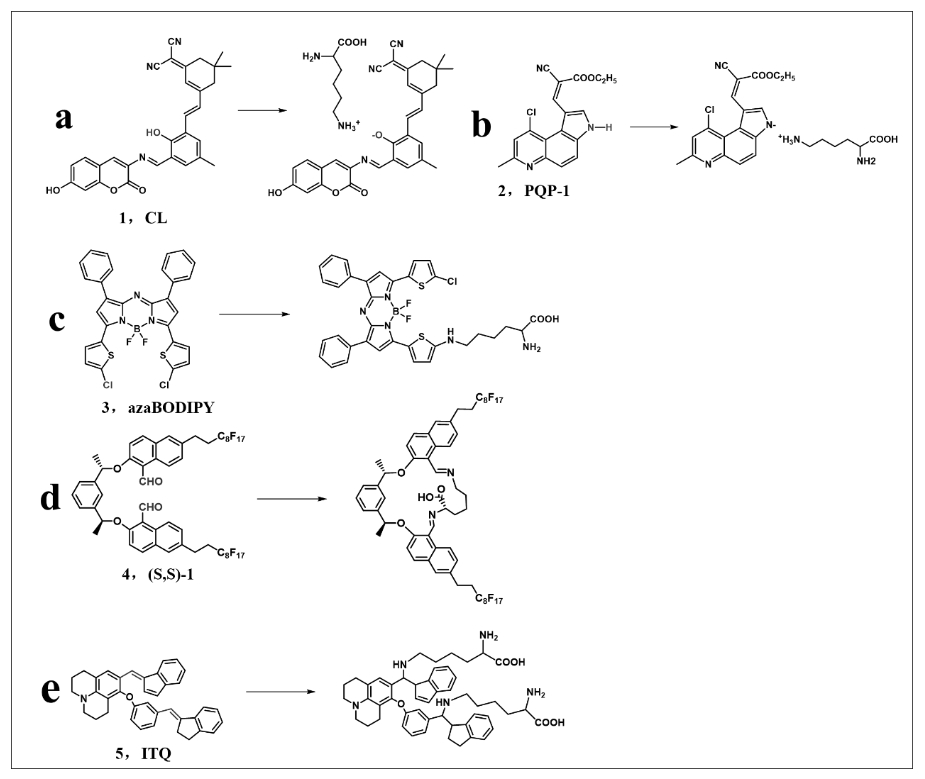 图9 探针或试剂与游离赖氨酸的修饰:(a)和(b)质子化反应;(c)亲核取代反应;(d)环化反应;(e)加成反应