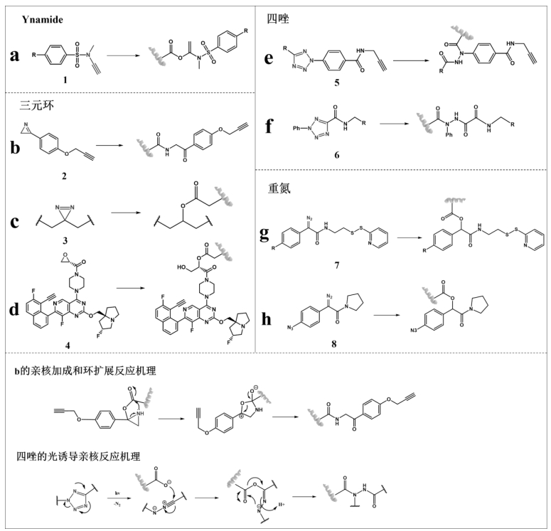 图11 谷氨酸或天冬氨酸的羧基修饰分为四类:(a)通过Ynamide试剂反应;(b)、(c)、(d)与三元环反应;(e)、(f)与四唑的反应;(g)、(h)与重氮基团反应