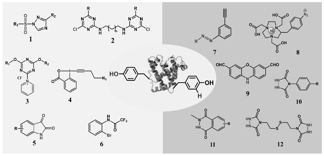 Fig.12 Two types of modifications of tyrosine residues: 1-6 are probes for modification of the phenolic hydroxyl group of the tyrosine side chain; 7-12 is the probe that modifies H on the ortho C of the phenol hydroxyl group of the side chain of tyrosine