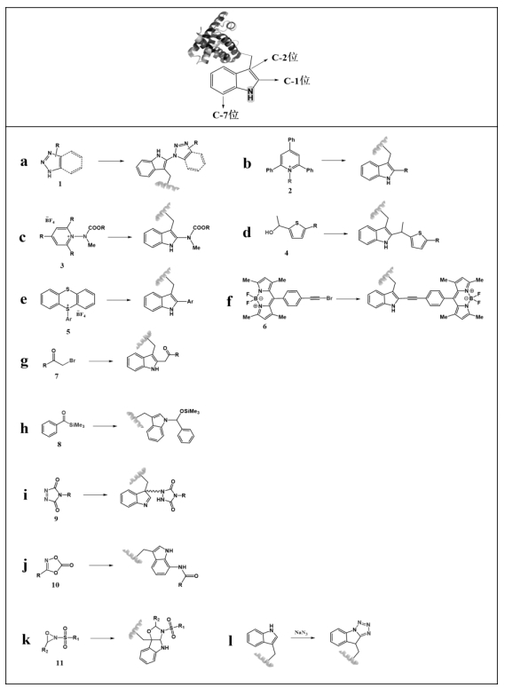 Fig.13 Tryptophan is modified by the C-1, N-H, C-2, and C-7 sites on the indole ring and different site-specific rings