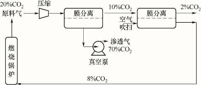 图10 三级耦合三段的膜法燃煤电厂烟气碳捕集工业示范装置工艺流程图[65]