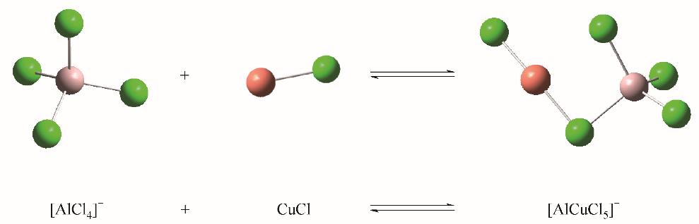 图10 [Bmim][AlCuCl5]、[Bmim][AlCuCl5]-1-己烯及[Bmim][AlCuCl5]-正己烷的AIM分析(球体代表原子;N:蓝色;H:白色;C:青色;Cl:绿色;Cu:橙色;Al:粉色)