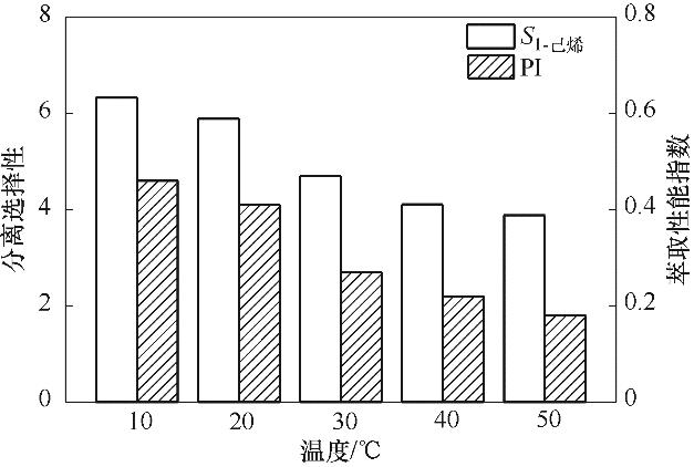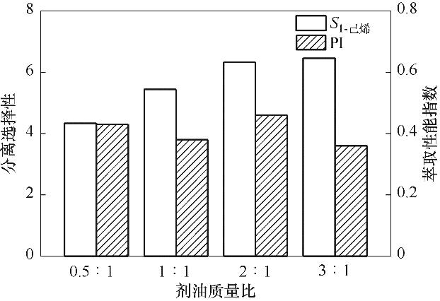 图6 剂油质量比对分离选择性和萃取性能指数的影响