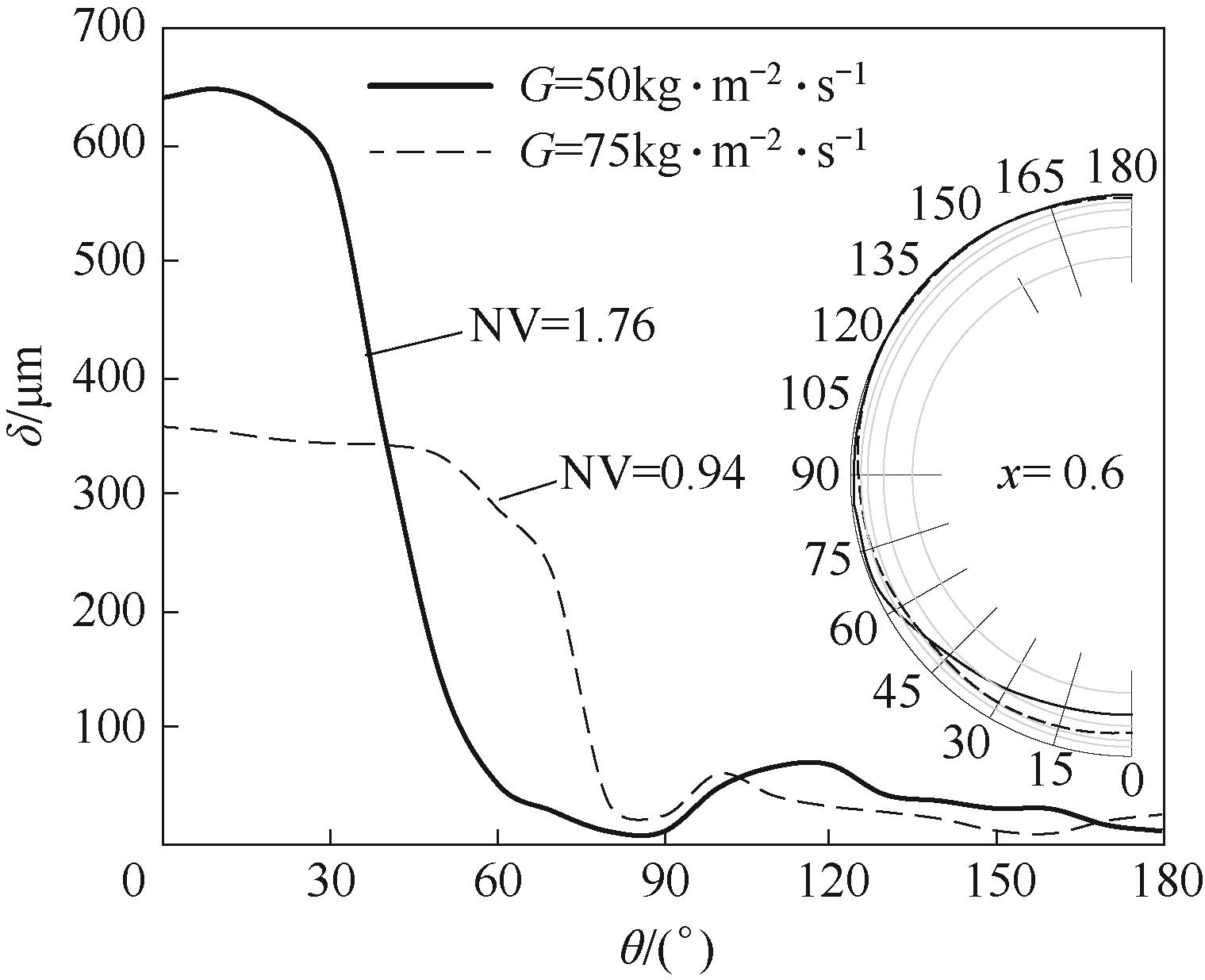 图9 通道内液膜厚度δ 随角度θ的变化(θ =0°为通道底部;θ =180°为通道顶部)
