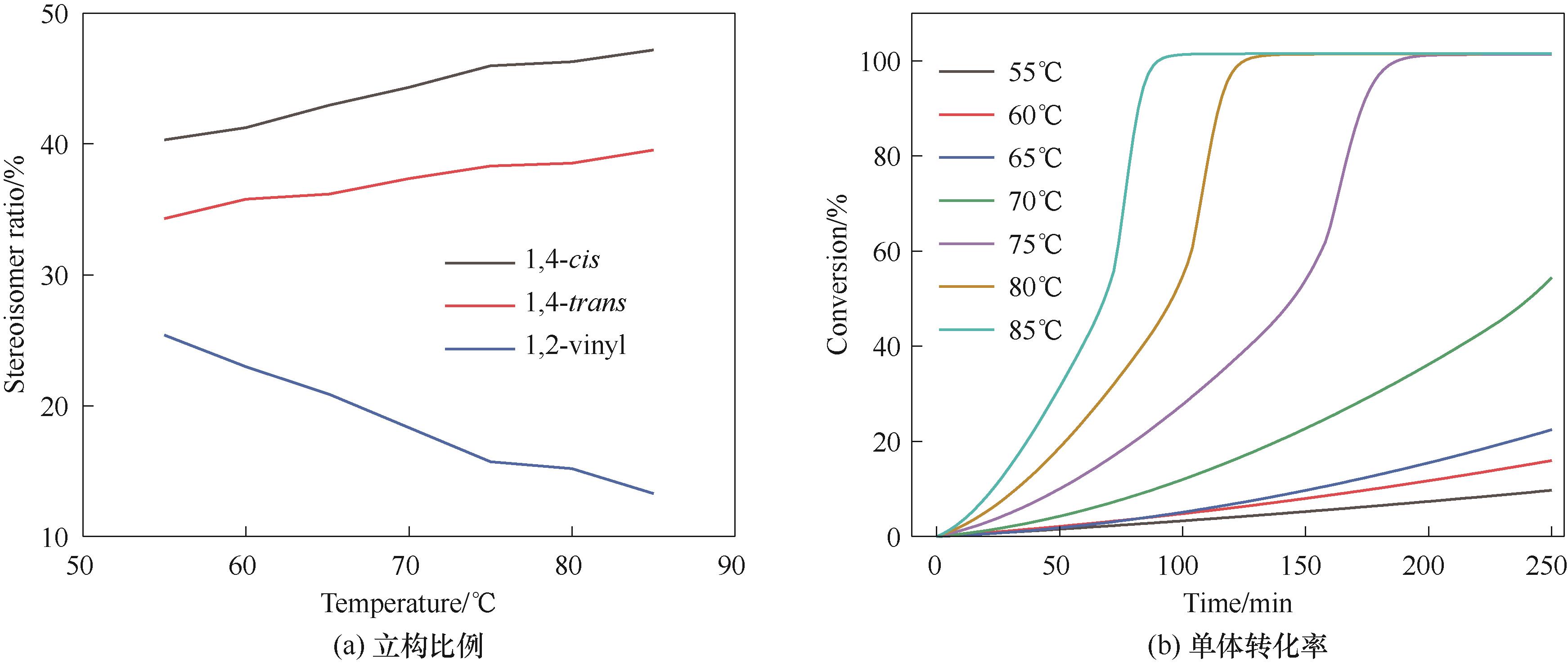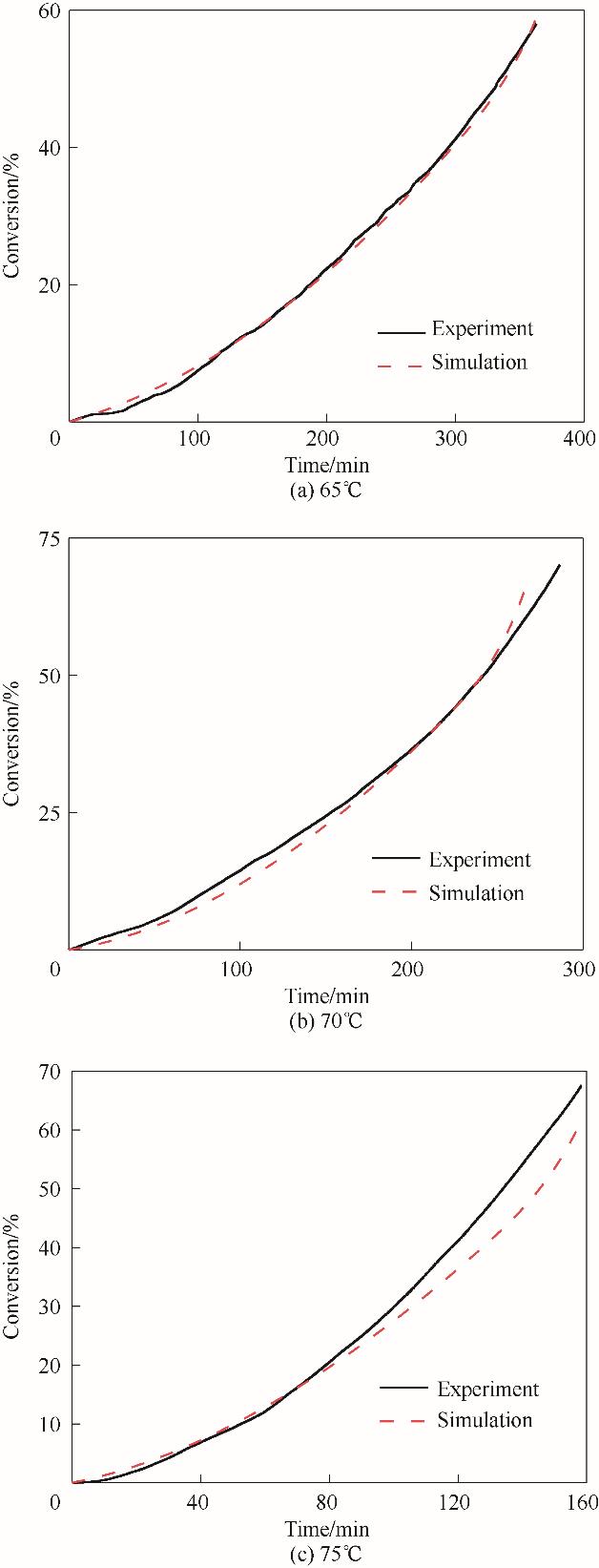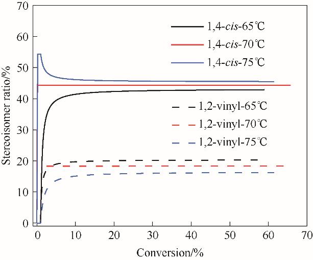 立体异构比例影响乳聚丁二烯(polybutadiene latex,PBL)的产品性能。在反应量热装置中以过硫酸钾作为引发剂,以松香酸钠/月桂酸钾/烷基萘磺酸钠作为乳化剂,研究了在反应温度为65~75℃、引发剂投料比(对每100单位质量单体添加引发剂的质量)为0.35%~1.38%下的丁二烯乳液聚合过程;建立了乳液法自由基聚合的严格过程机理模型,运用转化率数据进行参数整定,1, 4-顺式(1, 4-cis)、1, 4-反式(1, 4-trans)和1, 2-乙烯基(1, 2-vinyl)三种立构的链增长活化能分别为39.10、38.50、13.20 kJ/mol,指前因子分别为28.37、23.90、11.70 L/(mol·s),模型可以在误差范围内预测立体异构比例。模拟结果表明:立构比例随反应时间变化,立构比例的大幅变化发生在反应初期,在转化率达到20%后,三种立构比例均趋于稳定;温度升高,1, 4-cis和1, 4-trans比例增大,1, 2-vinyl比例减小;立构比例对引发剂投料比不敏感。