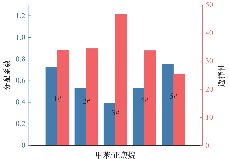 图5 甲苯/正庚烷体系中复配离子液体的分离性能1#—[bpy][BF4]/[4bpy][Tf2N][56]; 2#—[bpy][BF4] (0.7)/[4bmpy][Tf2N] (0.3)[57]; 3#—[emim][TCM] (0.8)/[emim][DCA] (0.2)[58]; 4#—[4bmpy][Tf2N](0.3)/[emim][CHF2CF2SO3](0.7)[59]; 5#—[4bmpy][Tf2N](0.5)/[emim][C2H5SO4](0.5)[60]