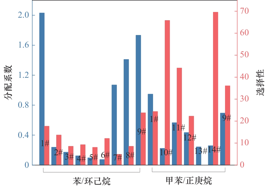 图6 芳烃与非芳烃体系中低共熔溶剂分离性能1#—1-butyl-3-methylimidazolium bromide/N-formylmorpholine[68]; 2#—tetrabutylammonium bromide/sulfolane[69]; 3#—tetrabutylammonium bromide/triethylene glycol[69]; 4#—methyltriphenylphosphonium bromide/tetraethylene glycol[69]; 5#—methyltriphenylphosphonium bromide/1,2 propanediol[69]; 6#—choline chloride/triethylene glycol[69]; 7#—tetrahexylammonium bromide/ethylene glycol l[70]; 8#—tetrahexylammonium bromide/glycerol[70]; 9#—N-ethylpyridinium bromide/ N-formyl morpholin[71]; 10#—ethyltriphenylphosphonium iodide/ethylene glycol[72]; 11#—ethyltriphenylphosphonium iodide/sulfolane[72]; 12#—tetrabutylphosphonium bromide/ethylene glycol[73]; 13#—tetrabutylphosphonium bromide/sulfolane[73]; 14#—pyridine based ionic liquid/acetylpropionic acid[74]