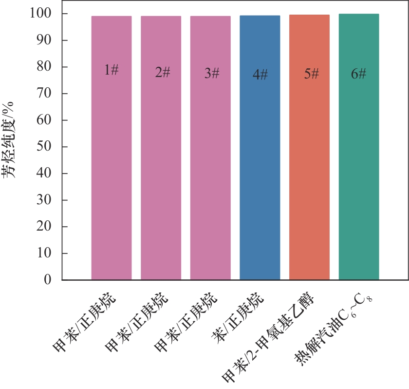 | 原料 | 溶剂 | 萃取温度/℃ | 萃取时间/min | 剂油比 | 芳烃纯度/% | 芳烃收率/% | 文献 |