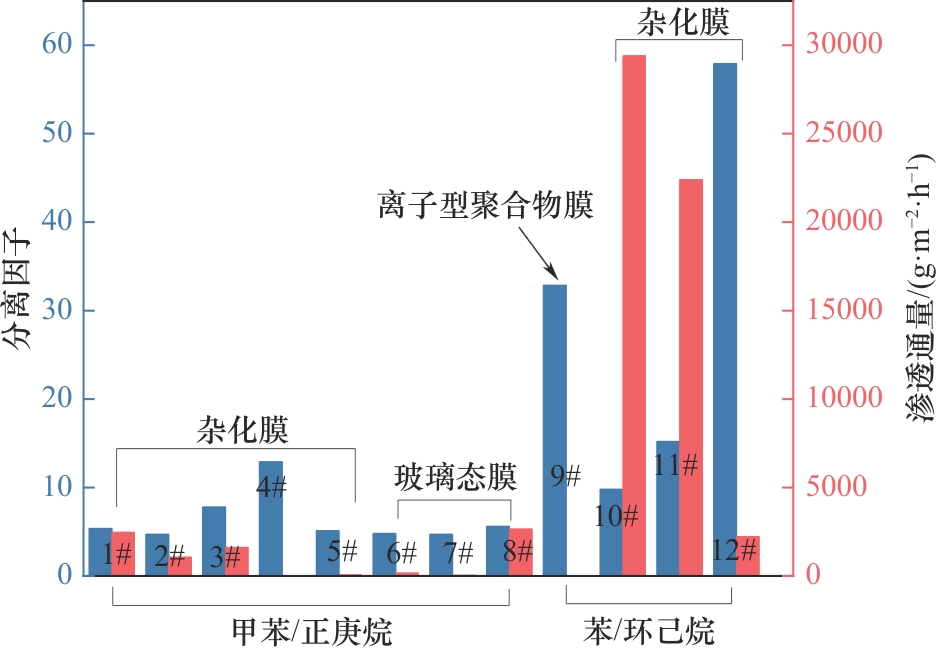 图9 芳烃与非芳烃体系中膜材料的分离性能1#—非对称聚丙烯腈/苯甲酮/聚乙二醇甲醚甲基丙烯酸酯接枝复合膜[96]; 2#—聚丙烯腈/甲基丙烯酸甲酯-甲基丙烯酸钾盐/十二烷基二甲基苄基氯化铵膜[102]; 3#—聚丙烯腈/聚乙二醇甲基丙烯酸酯接枝复合膜[103]; 4#—不对称聚丙烯腈/聚乙烯醇-氧化石墨烯[104]; 5#—Boltorn W3000“孔填充”陶瓷复合膜[105]; 6#—聚酰亚胺膜[106]; 7#—芳香族聚酰亚胺和聚苯并𫫇唑膜[107]; 8#—杂萘联苯聚芳醚腈酮/聚乙二醇甲基丙烯酸酯接枝复合膜[108]; 9#—[3-Mebupy][BF4]聚偏二氟乙烯支撑液膜[109]; 10#—聚己二酸乙二醇酯/聚氨酯脲膜[98]; 11#—聚己二酸乙二醇酯/聚氨酯酰亚胺膜[98]; 12#—海藻酸钠/羧甲基纤维素钠共混膜[110]