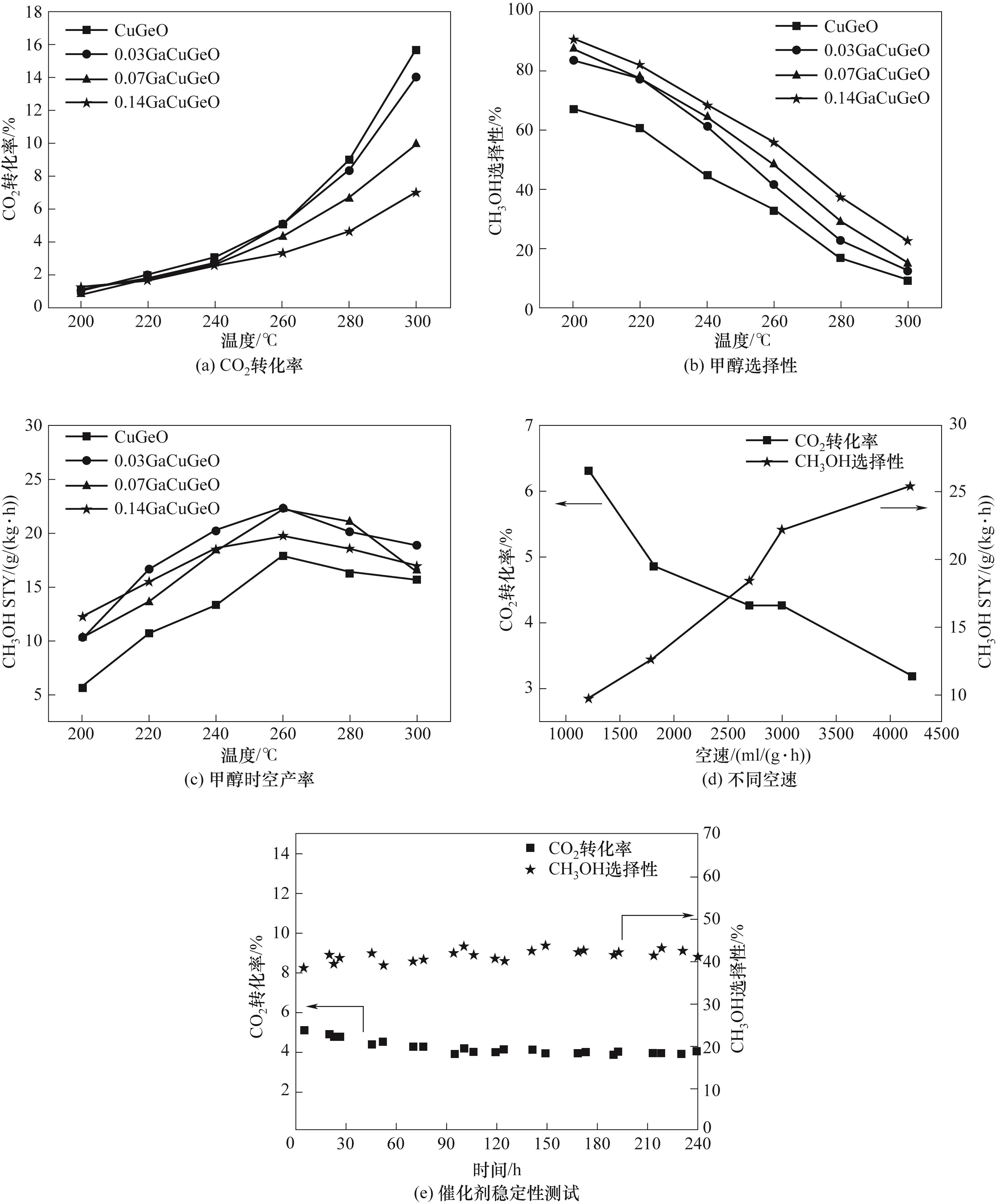 CO2加氢制甲醇是缓解全球气候变暖、实现碳资源再利用的有效途径。Cu/CeO2催化剂是CO2加氢制甲醇的一类重要催化剂,但其甲醇选择性仍有待进一步提高。本文通过引入不同含量的Ga2O3制备了xGaCuCeO催化剂,以调控其甲醇选择性。研究结果显示,Ga2O3增强了催化剂表面CO2的吸附强度,提高了催化剂表面氧空位含量,从而提高了xGaCuCeO催化剂的甲醇选择性。在260℃和3.0 MPa条件下,与CuCeO催化剂相比,Ga含量为1.1% (质量分数)的0.07GaCuCeO催化剂的甲醇选择性提高了47%,时空产率提高了26% (22.4 g·kg-1·h-1)。