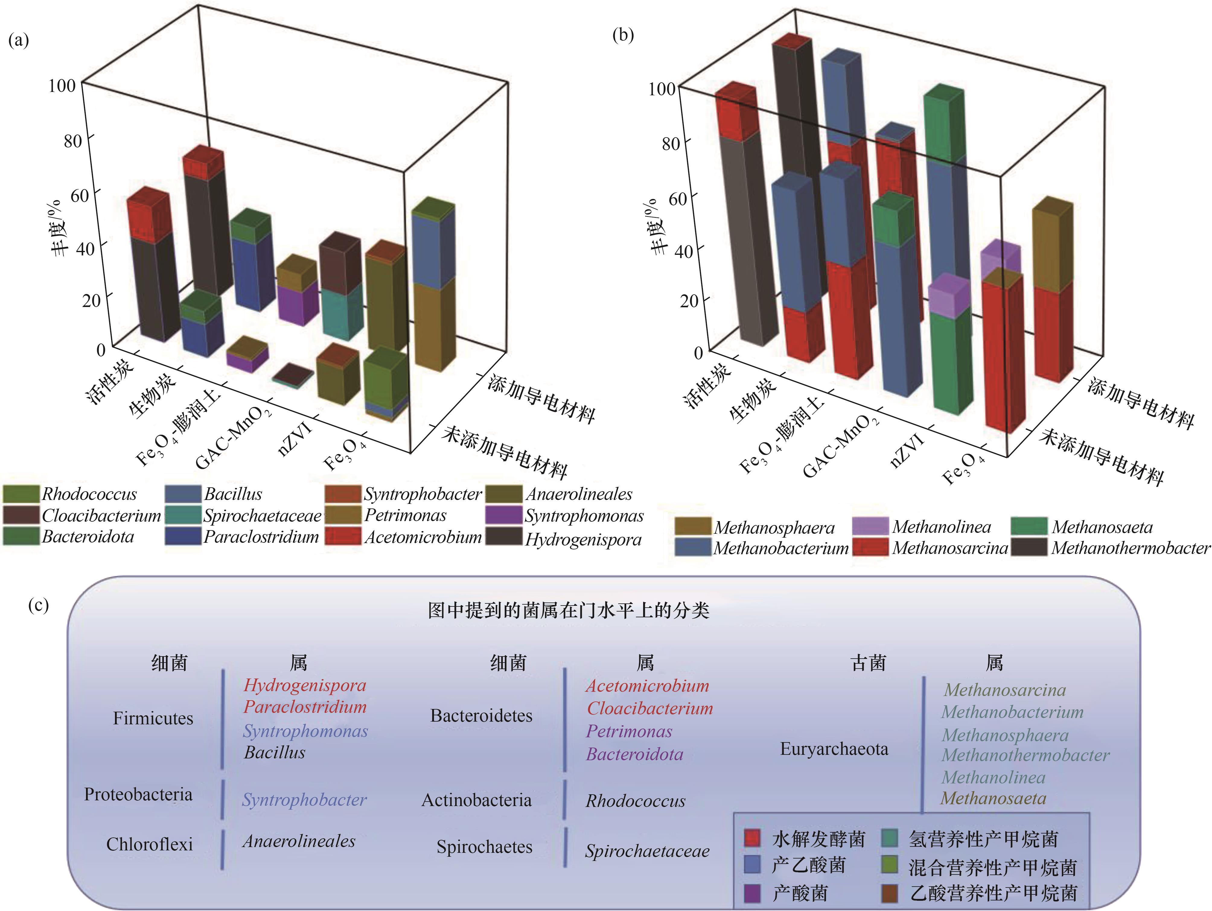 Fig.2 Dynamics of microbial community structure mediated by conductive materials[18,59,62,73-75]: (a) Changes in functional bacterial abundance; (b) Changes in methanogenic archaeal abundance; (c) Systematics at phylum level for key bacterial genera