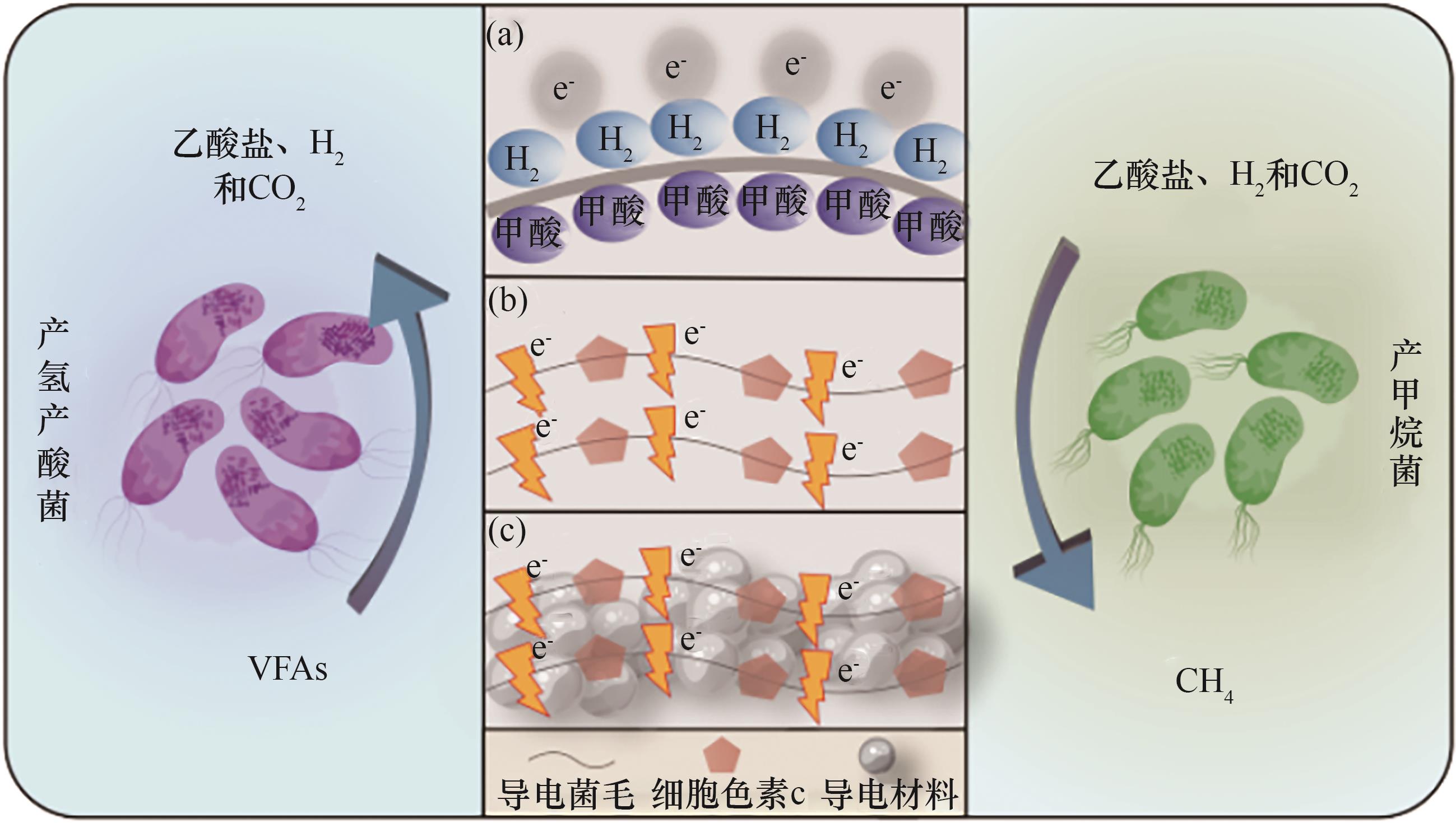 图3 种间电子传递的机制转变:(a)氢/甲酸载体介导的种间电子传递; (b)生物导电结构(菌毛/细胞色素)介导DIET; (c)导电材料介导DIET