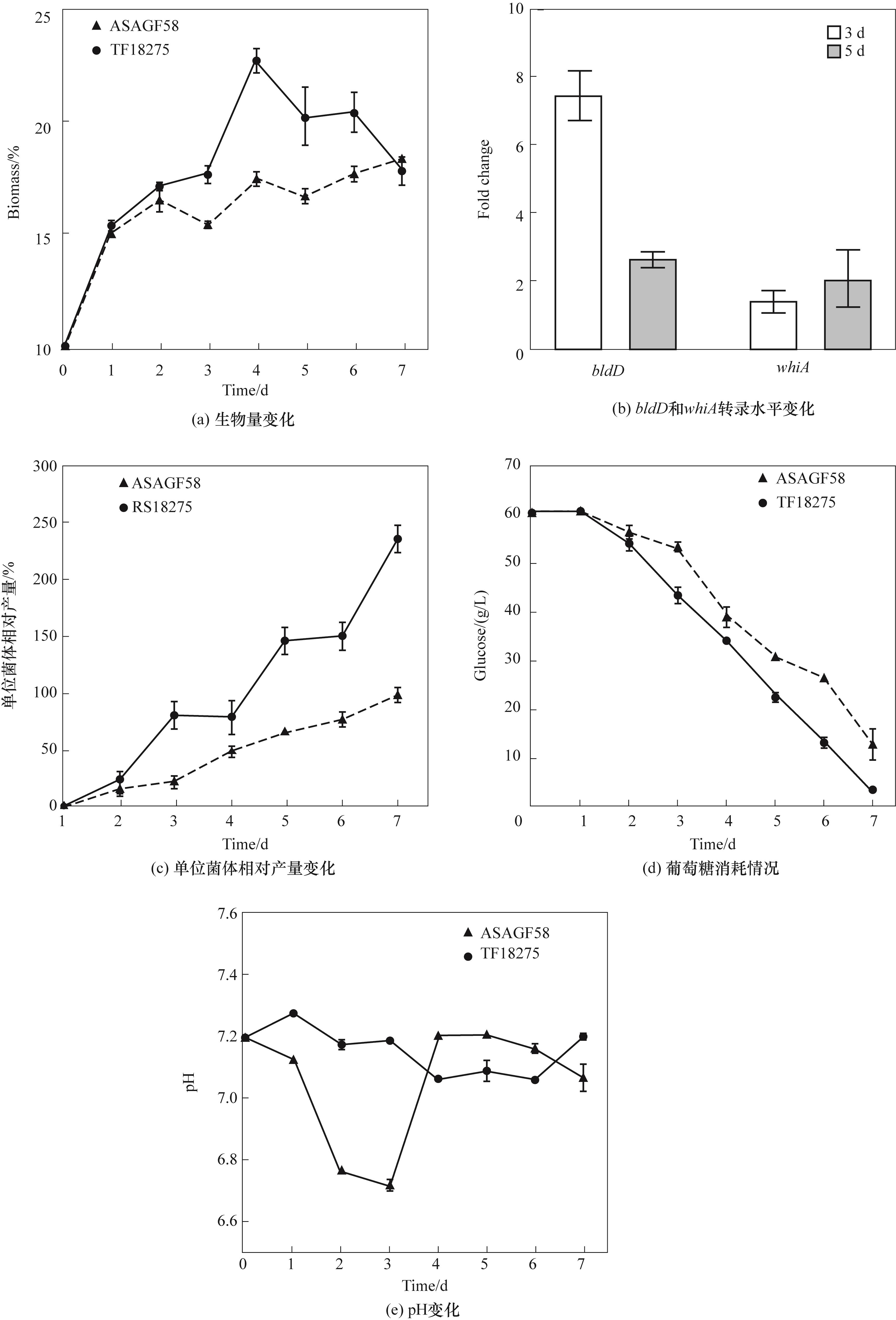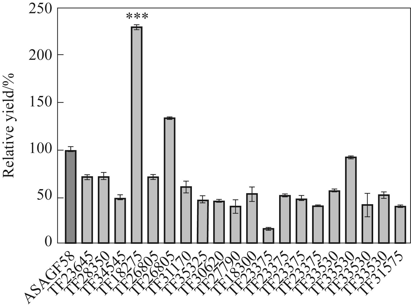 丁烯基多杀菌素(butenyl-spinosyn)是由须糖多孢菌(Saccharopolyspora pogona)产生的新型绿色生物杀虫剂,然而,由于其代谢网络复杂、遗传背景不清晰、调控机制未得到充分解析,导致其合成效率低,难以满足实际需求。本研究基于对S. pogona ASAGF58和S. pogona ASAGF40转录组学数据分析,挖掘参与次级代谢调控、影响丁烯基多杀菌素合成的LysR家族转录调控因子并构建相关工程菌株。结果显示,RS18275使丁烯基多杀菌素产量达到67.1 mg/L,为出发菌ASAGF58的2.3倍,同时促进细胞生长,菌体生物量提高30.63%,并加快了底物葡萄糖的消耗。比较转录组学分析表明,RS18275通过调控初级代谢途径增强了乙酰辅酶A等前体供应,上调丁烯基多杀菌素生物合成途径关键基因提高了产物合成通量。基于比较转录组学分析和验证,初步解析了RS18275作为全局调控因子,通过调控初级代谢与次级代谢实现目标化合物高效合成的生理机制,为后续丁烯基多杀菌素的高效合成提供理论与工程化策略。