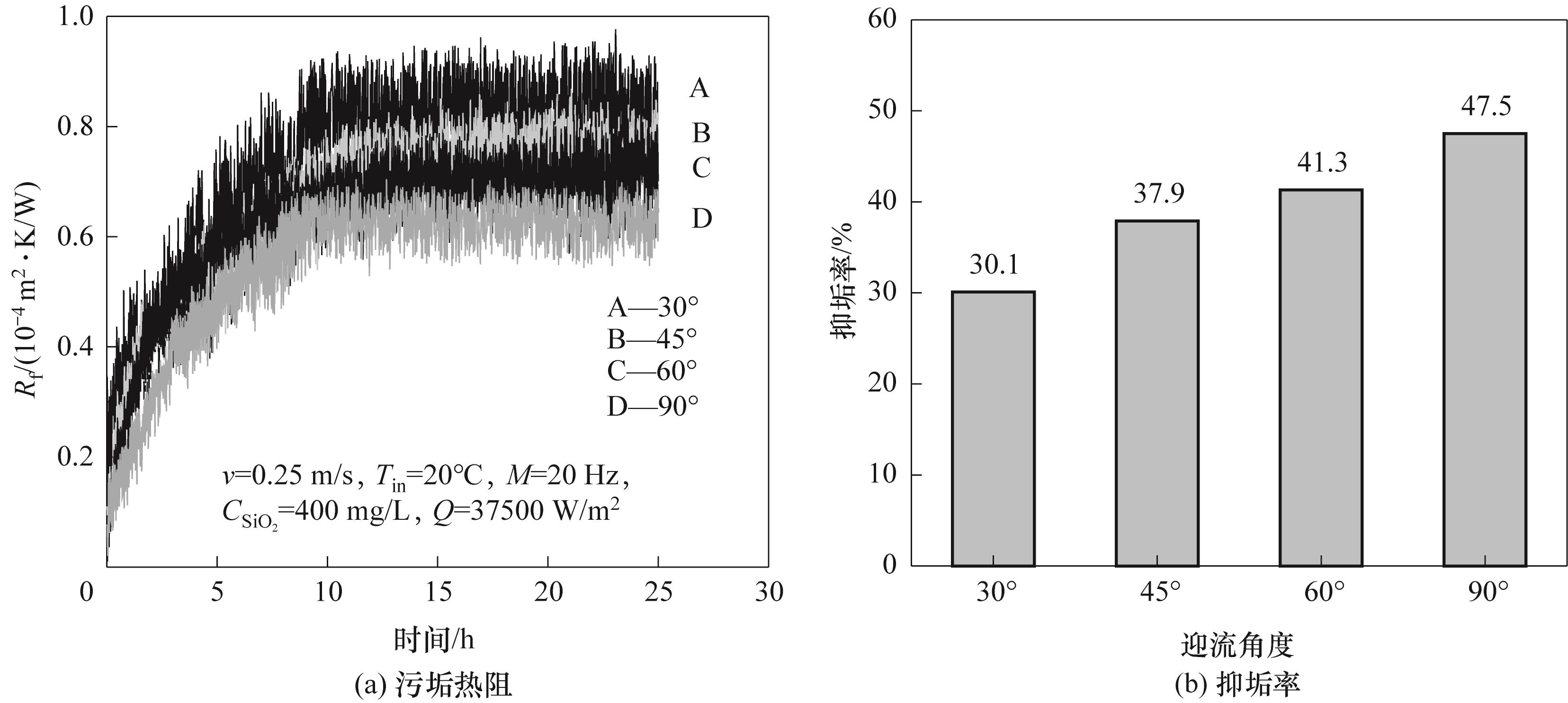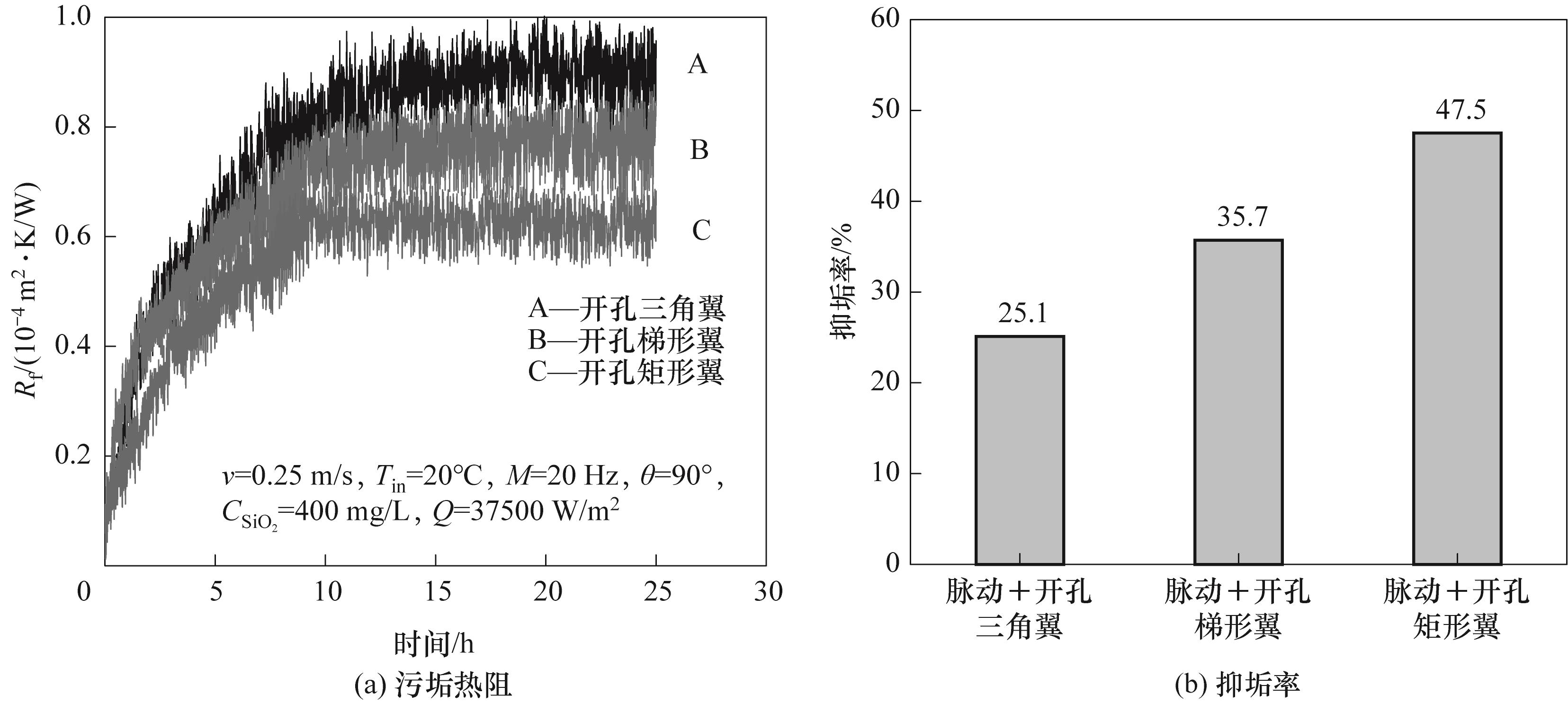 为解决换热器通道内的颗粒污垢问题,通过搭建实验台研究了脉动通道内开孔涡流发生器的抑垢特性。对比了四种不同类型通道的颗粒污垢特性;研究了脉动通道内不同翼型开孔涡流发生器的颗粒沉积特性;分析了开孔矩形翼涡流发生器迎流角度对颗粒污垢的影响规律。结果表明,相较于光滑通道,脉动通道的抑垢率为15.7%,脉动+矩形翼通道的抑垢率为41.2%,脉动+开孔矩形翼通道的抑垢效果最佳,其抑垢率为47.5%。对比三种不同翼型(三角翼、梯形翼、矩形翼)开孔涡流发生器,发现开孔矩形翼涡流发生器的抑垢效果最好。当迎流角度小于90°时,污垢热阻随着开孔矩形翼涡发生器迎流角度的增大逐渐减小,当迎流角度为90°时污垢热阻达到最小。