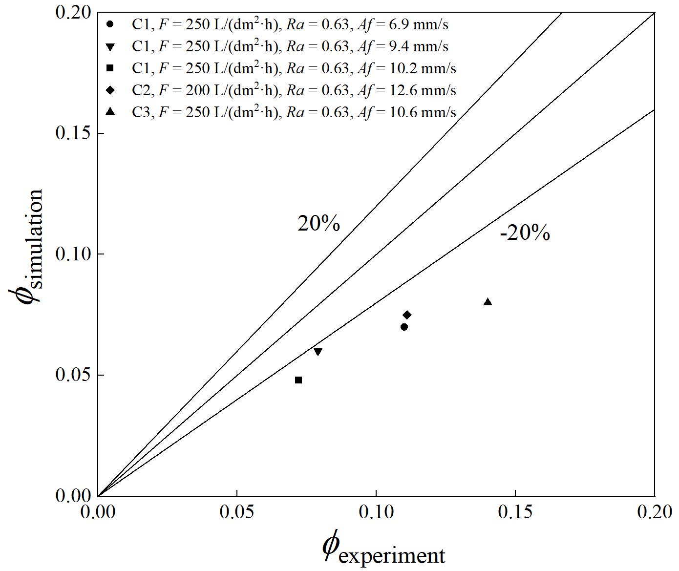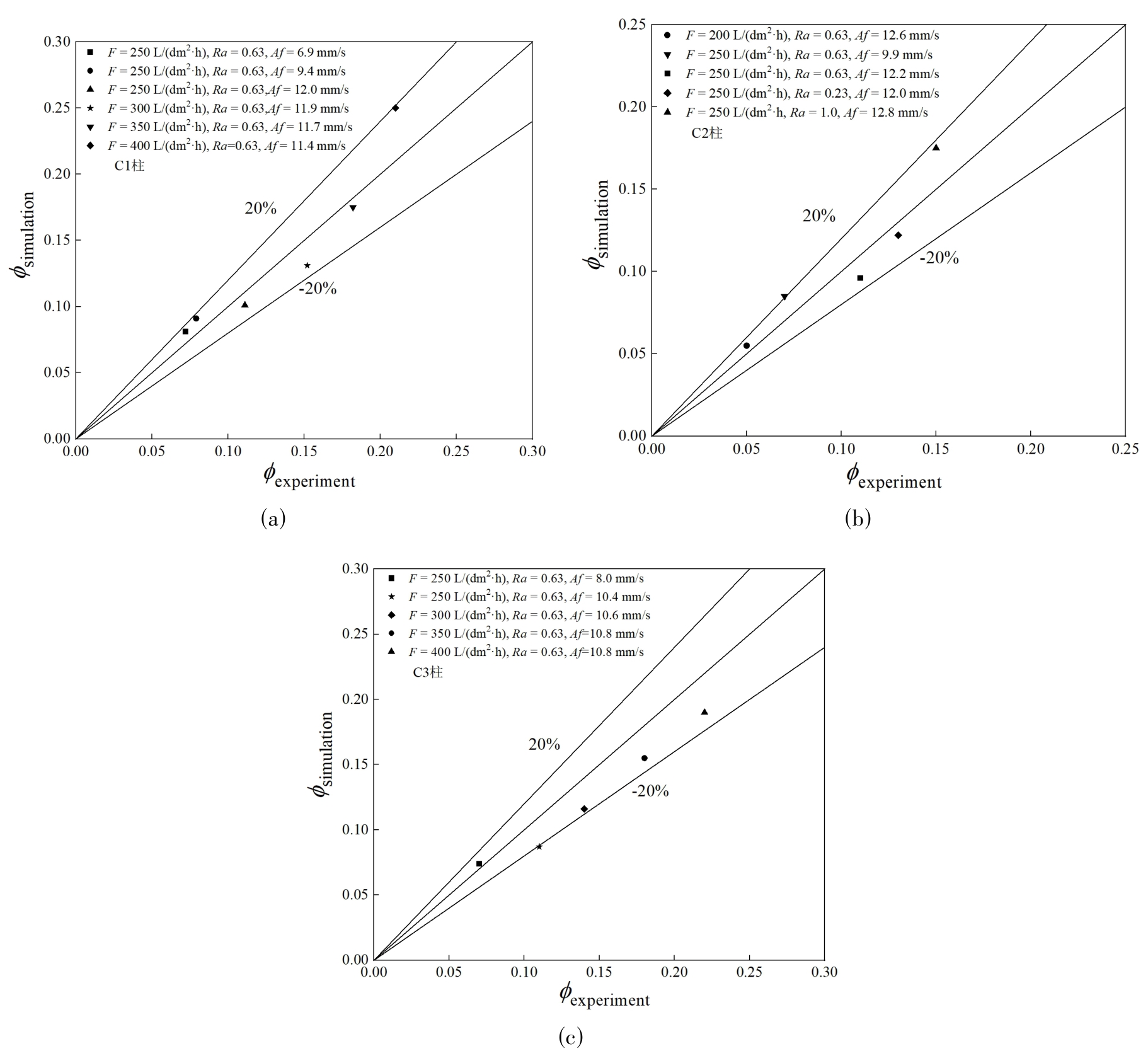 图6 近板区等效液滴尺寸算法下,有机相连续工艺过程中分散相存留分数模拟与实验结果对比