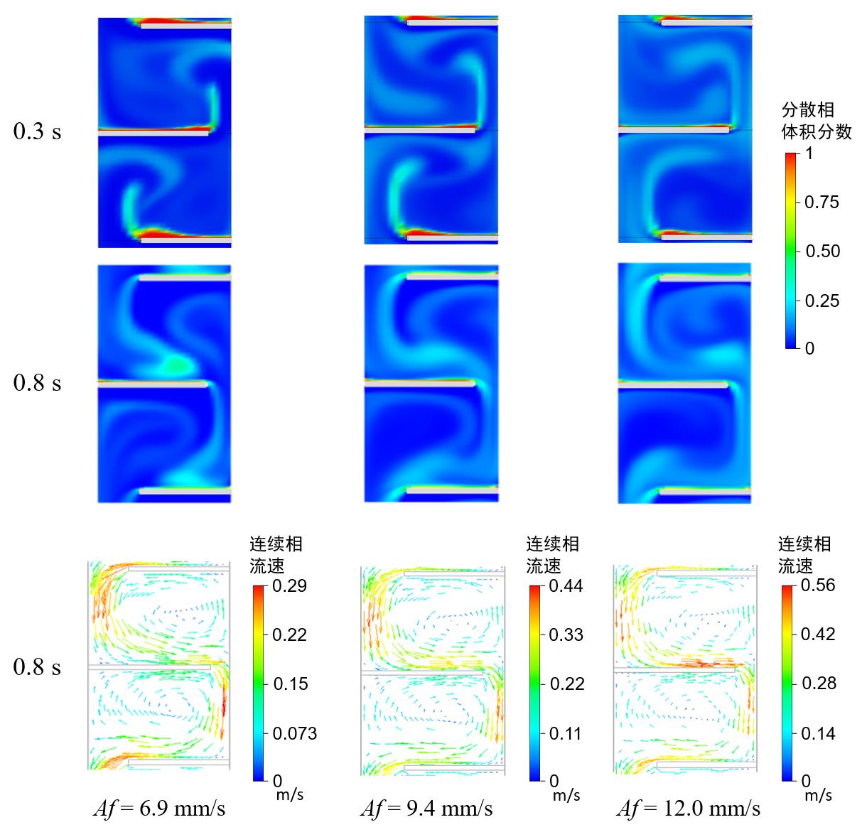 Fig. 9 Dispersed phase volume fraction profile and continuous phase velocity vector in one pulsation cycle in continuous aqueous phase process. (Column C1, F = 250 L/(dm2·h), Ra = 0.91, Af = 7 mm/s. The starting time of a certain pulse period is set as 0 s after the steady state is reached.)
