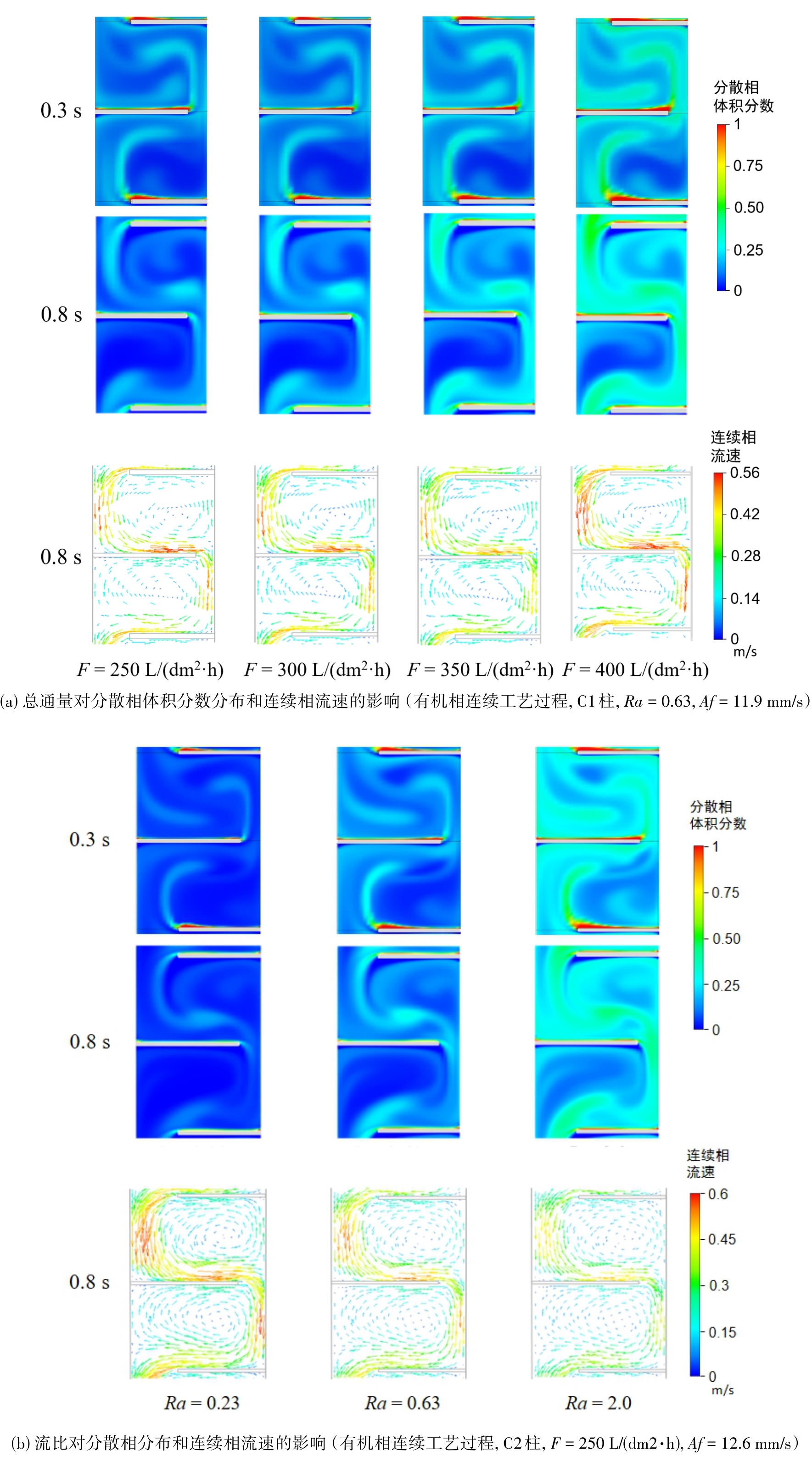图11 总通量和流比对分散相体积分数分布和连续相流速的影响(以达到稳态后某一脉冲周期的起始时间为0 s)