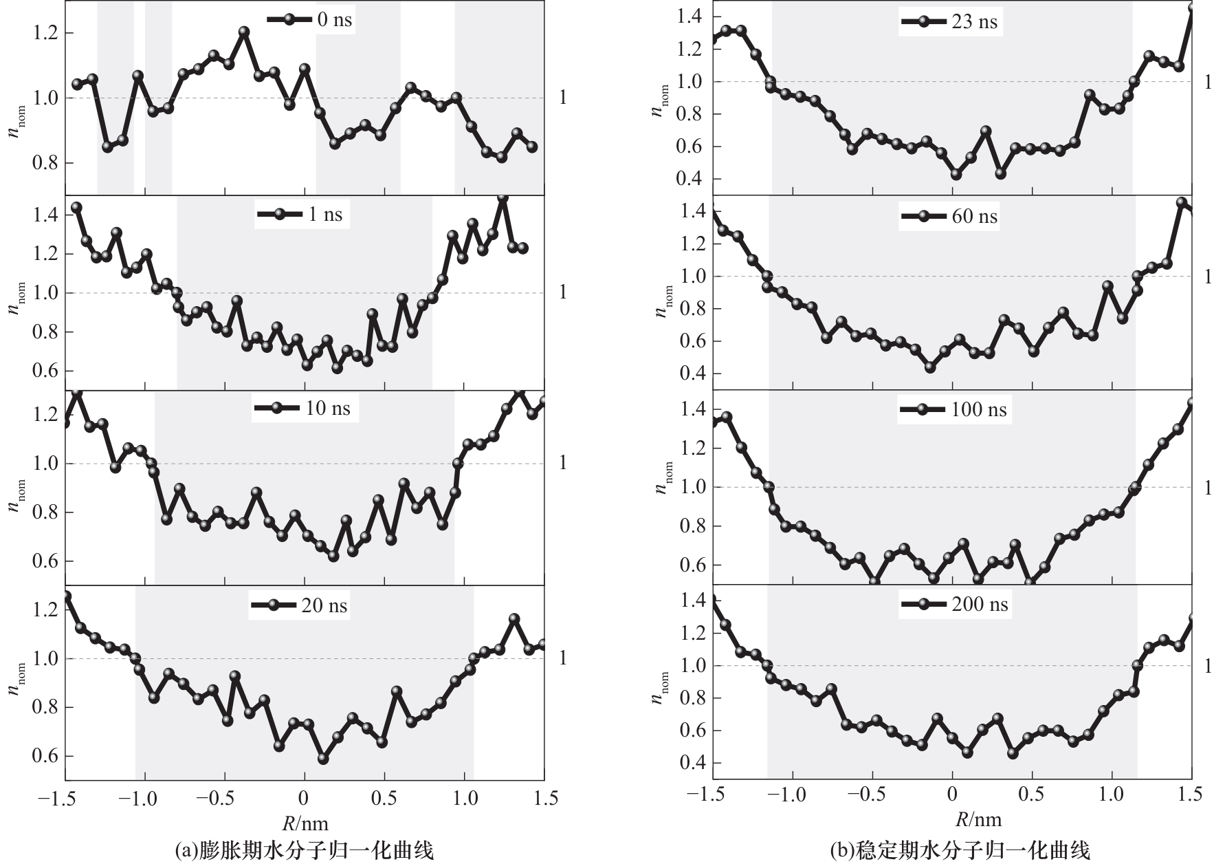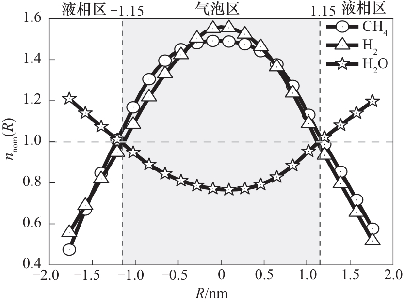 水合物储氢具有环境友好、经济性高的优点,在储能领域具有广阔的应用前景。水合物合成前期易形成气体分子的过饱和状态,进而诱导生成纳米气泡,这会对水合物储氢效率产生影响。因此,本文以纳米气泡为研究对象,采用分子动力学数值模拟方法,围绕甲烷与氢气混合气体合成储氢水合物阶段,分析纳米气泡的演化规律,探究纳米气泡演化过程对气体分子扩散、水分子有序度和气体相互作用的影响。结果表明,纳米气泡的生成经历膨胀期与稳定期,可有效促进气体分子扩散。但纳米气泡对甲烷分子的促进作用强于对氢气分子,进而影响水合物的储氢密度。纳米气泡在膨胀期会提升水分子的有序度,在稳定期水分子的有序度逐渐趋于恒定。气泡内部的氢气分子倾向于在中心区域聚集分布,甲烷分子则富集于气液界面,该分布特征虽利于水合物成核,却可能影响水合物结构内的氢气含量。