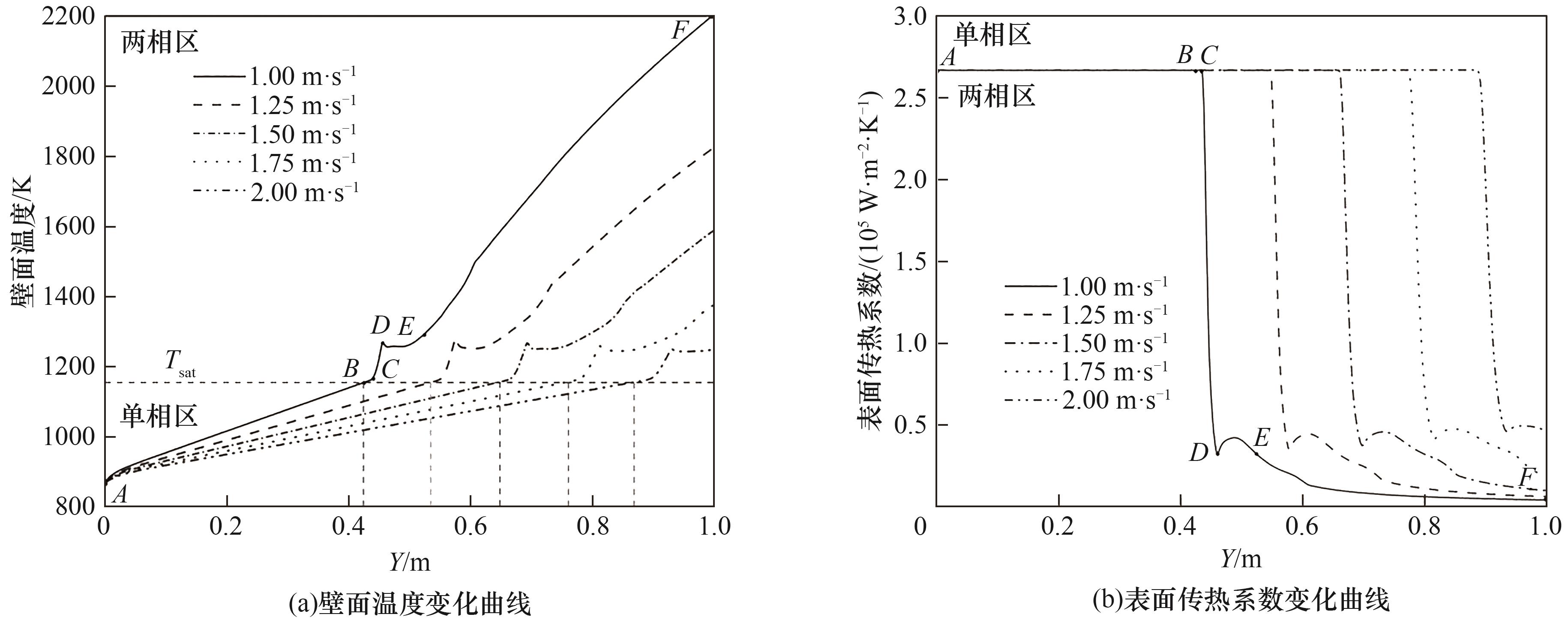 Fig.7 Distribution of wall temperature and surface heat transfer coefficient along the channel under different inlet velocities