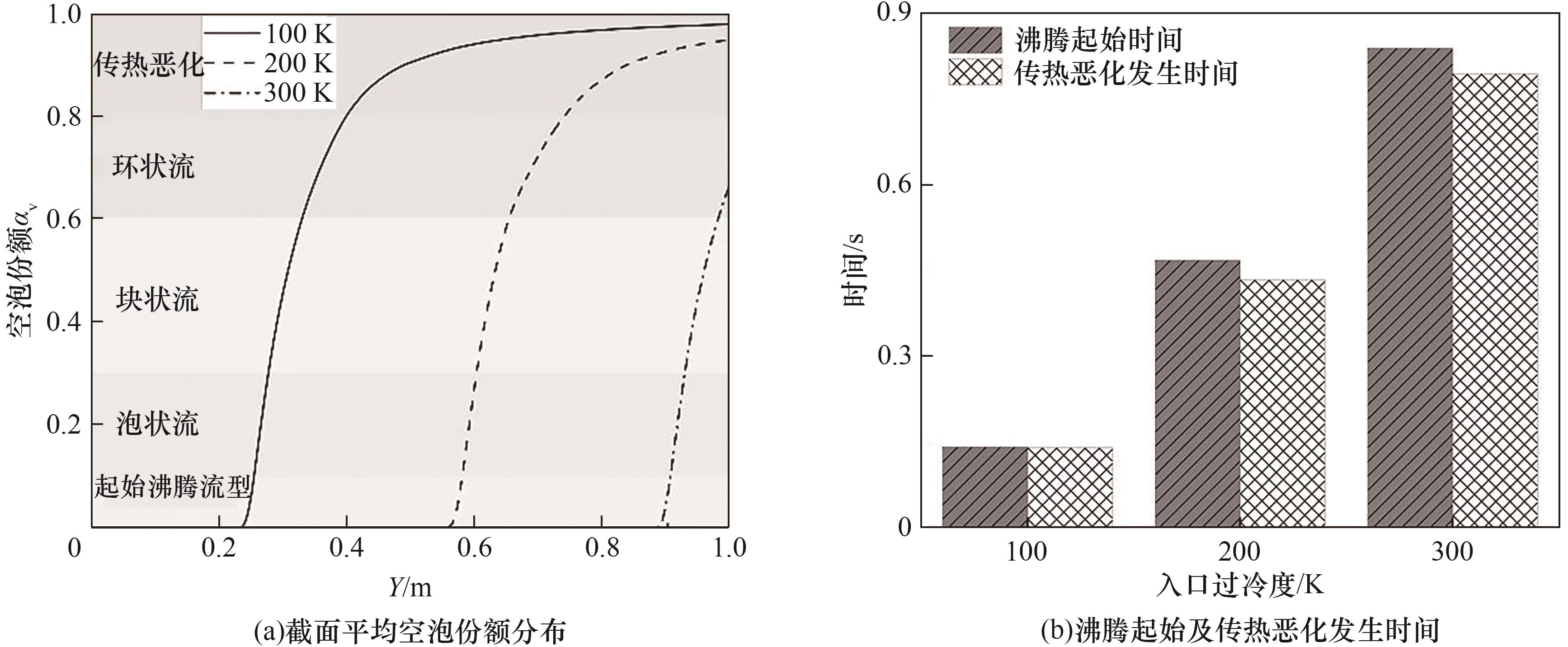 图12 不同入口过冷度下截面平均空泡份额和沸腾起始及传热恶化发生时间