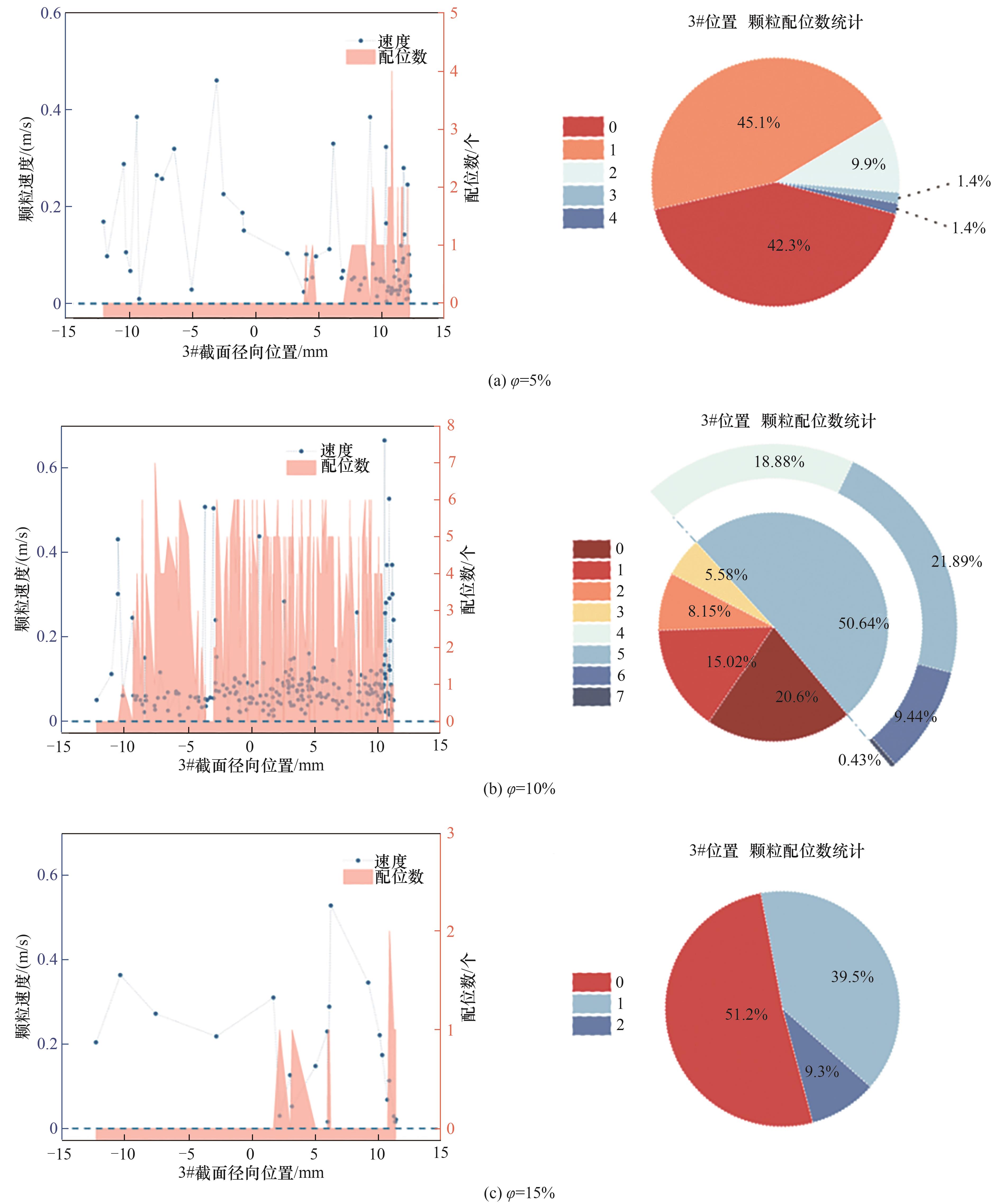 图17 不同颗粒体积分数下3#截面位置水合物颗粒速度随截面径向分布及颗粒配位数统计