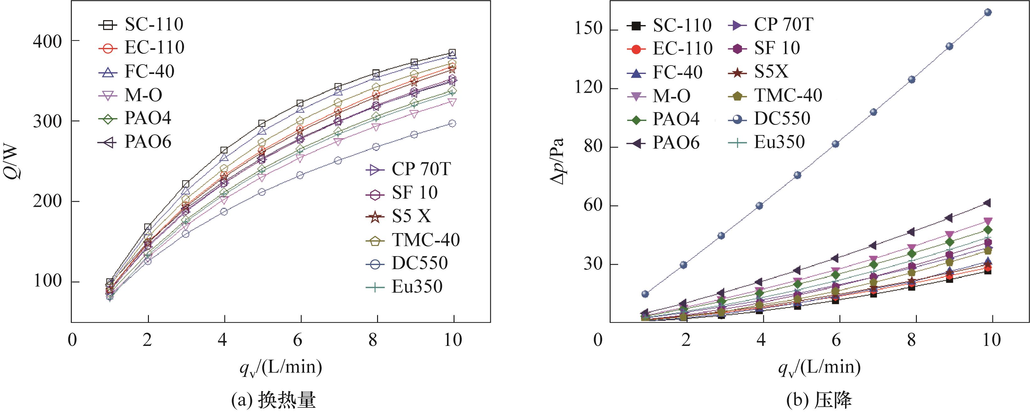 随着服务器功耗持续攀升,传统风冷技术因能耗高、噪声大及冷却能力不足等缺陷逐渐受限。单相浸没液冷技术凭借传热系数大、能耗低、噪声低等优势成为研究热点。首先,针对矿物油、硅油和氟碳液三种典型单相浸没冷却液的物性进行对比分析。结果显示,油基冷却液(矿物油与硅油)的密度约为氟碳液的1/2,比热容和热导率接近氟碳液的2倍,但黏度却高出氟碳液1~2个数量级,导致边界层厚度显著增加。其次,以典型服务器为研究对象,采用计算流体力学(CFD)方法模拟不同冷却液的冷却效果,并提出析热系数(HDC)作为性能评价指标。HDC分析表明,SS-110冷却液具有优异的流动换热特性,其核心优势在于极低的运动黏度。最后,设计并搭建单相浸没液冷实验系统,对矿物油的冷却效果进行实测。实验结果显示,在矿物油流量为1080 L/h时,可以带走1600 W的热量,但是存在流量分配不均匀现象,导致不同环氧树脂板上的发热片平均温度相差可达到9.8℃。此外,实验发现导热硅脂在硅油环境中出现部分溶解现象,因此,不建议将导热硅脂应用于以硅油为冷却介质的浸没液冷系统。