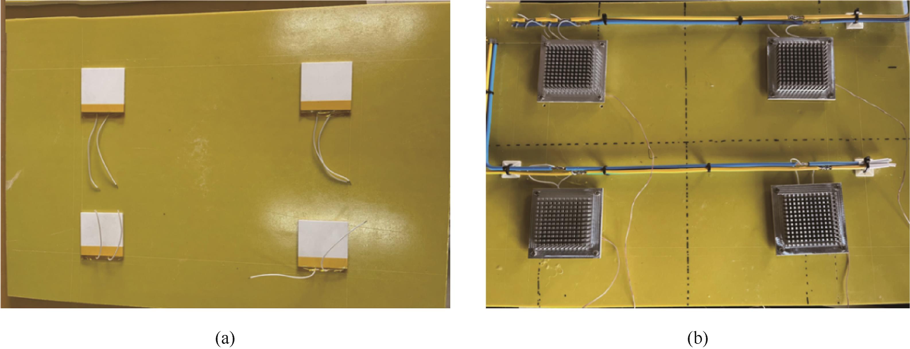 图10 (a)环氧树脂板和陶瓷发热片;(b)装有铝散热器的陶瓷发热片和环氧树脂板