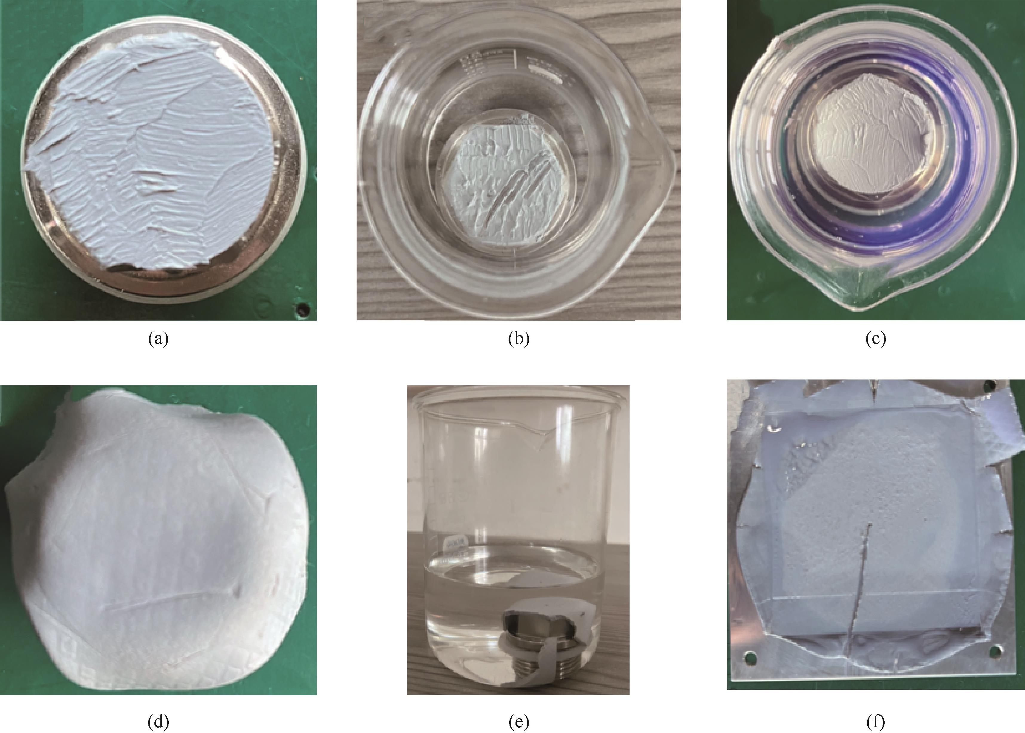 图14 放置在空气中(a)、硅油中(b)、矿物油(c)中的导热硅脂和放置在空气中(d)、硅油中(e)、矿物油中(f)的导热垫片
