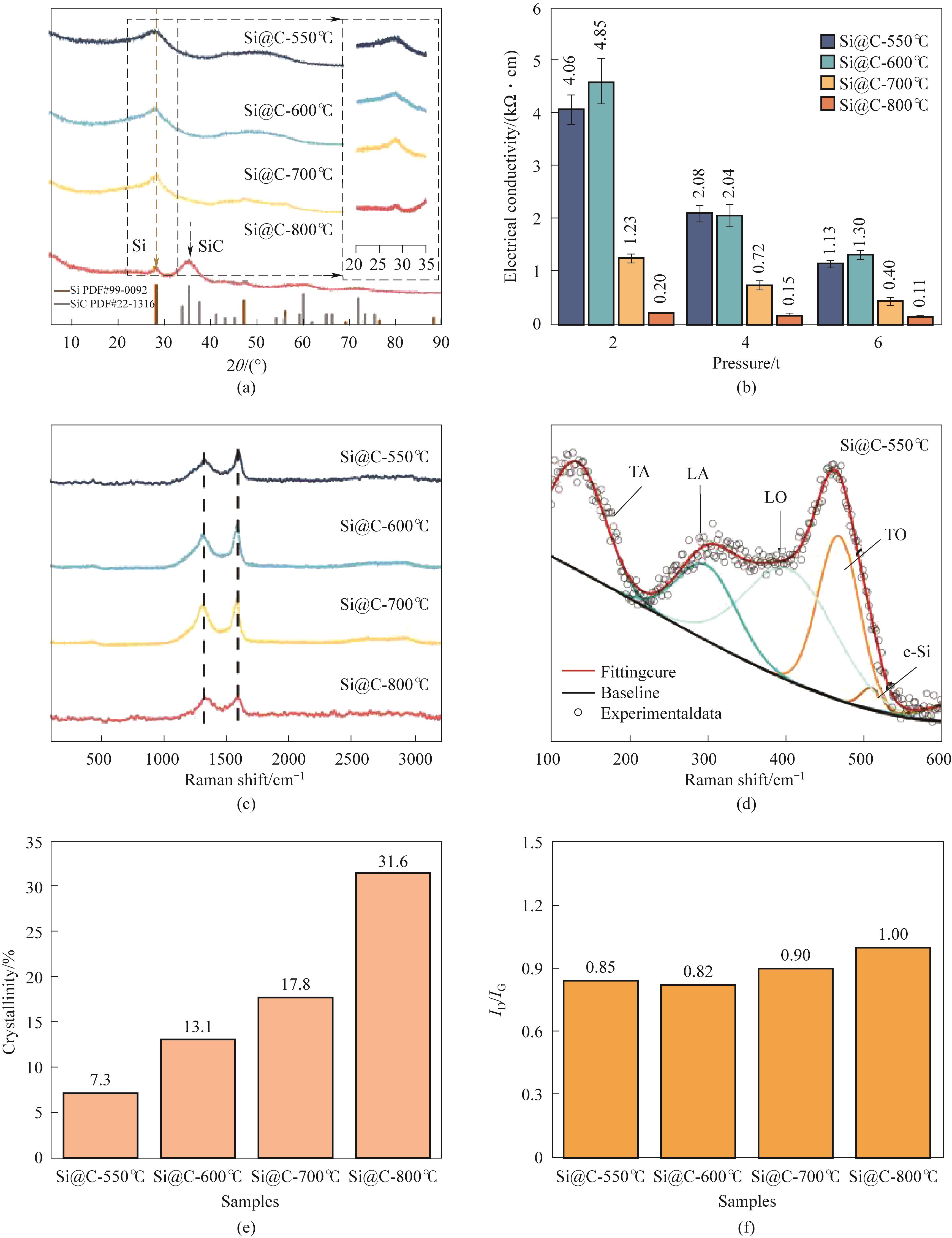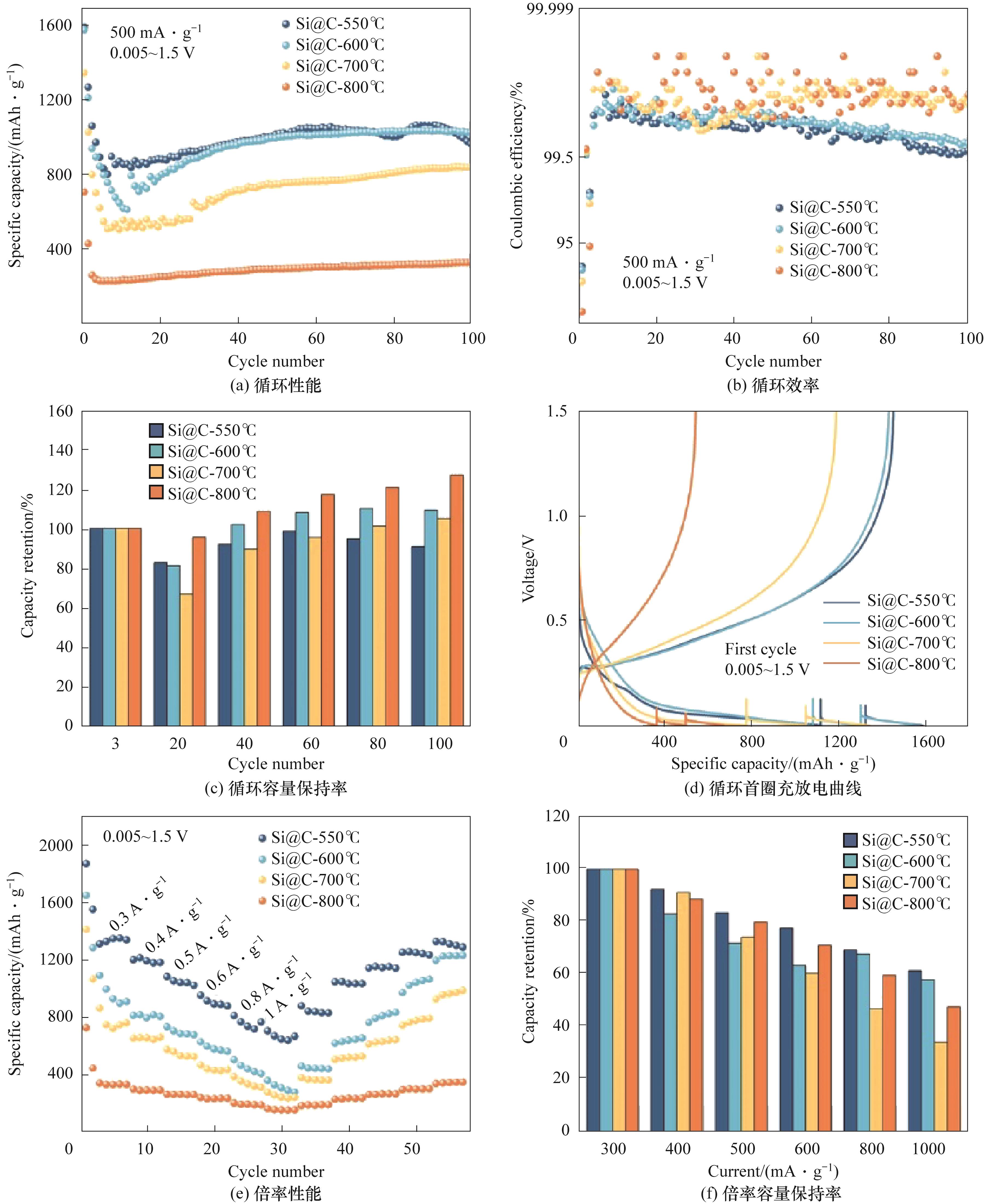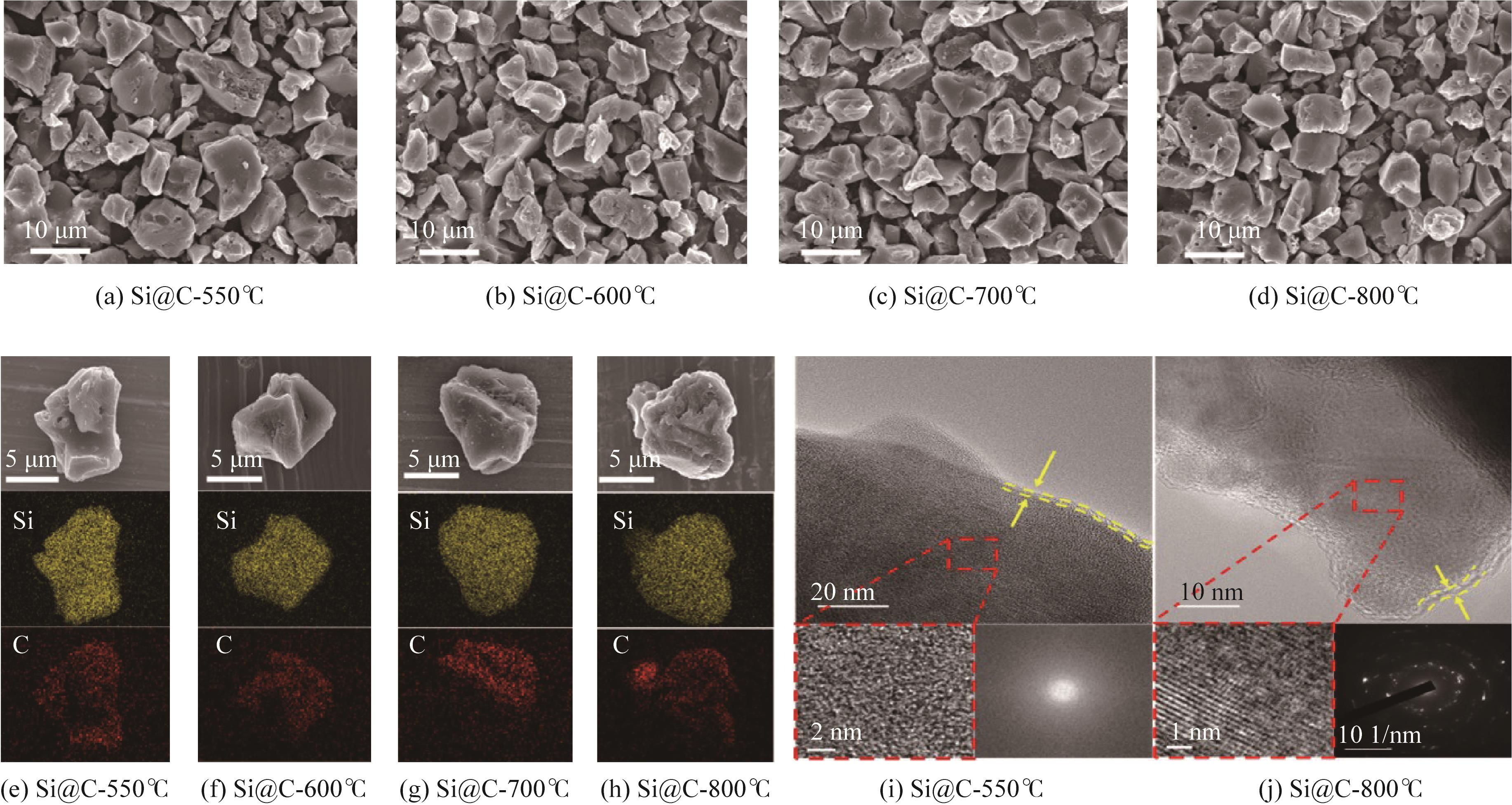 硅作为高能量密度锂离子电池的新一代负极材料,其商业化应用的关键技术路径之一是与碳材料复合构建核壳结构的硅碳材料。如何实现硅晶粒形态的精确控制是当前硅碳材料产业化量产过程中的难题之一。采用化学气相沉积法将纳米/亚纳米尺寸硅均匀沉积在多孔碳基体中制备气相沉积硅碳复合材料,通过调控最终碳层封装温度实现了硅结晶度的可控调节。结果表明,拉曼光谱技术较X射线衍射方法在硅结晶度表征方面具有更高的灵敏度与准确率优势;碳层封装温度影响硅碳中硅的结晶度水平,硅结晶度升高会对材料的整体电化学性能有负面影响。碳层封装温度在550℃时制备的硅碳表现出1599 mAh·g-1的首圈放电容量和91.62%的首次库仑效率,升高到800℃时降低到了709 mAh·g-1和80.97%。研究结果为气相沉积硅碳材料量产过程实现硅结晶度的准确控制提供了可靠方法,可实现高性能低结晶度硅碳负极量产过程中的高精度一致性管控。