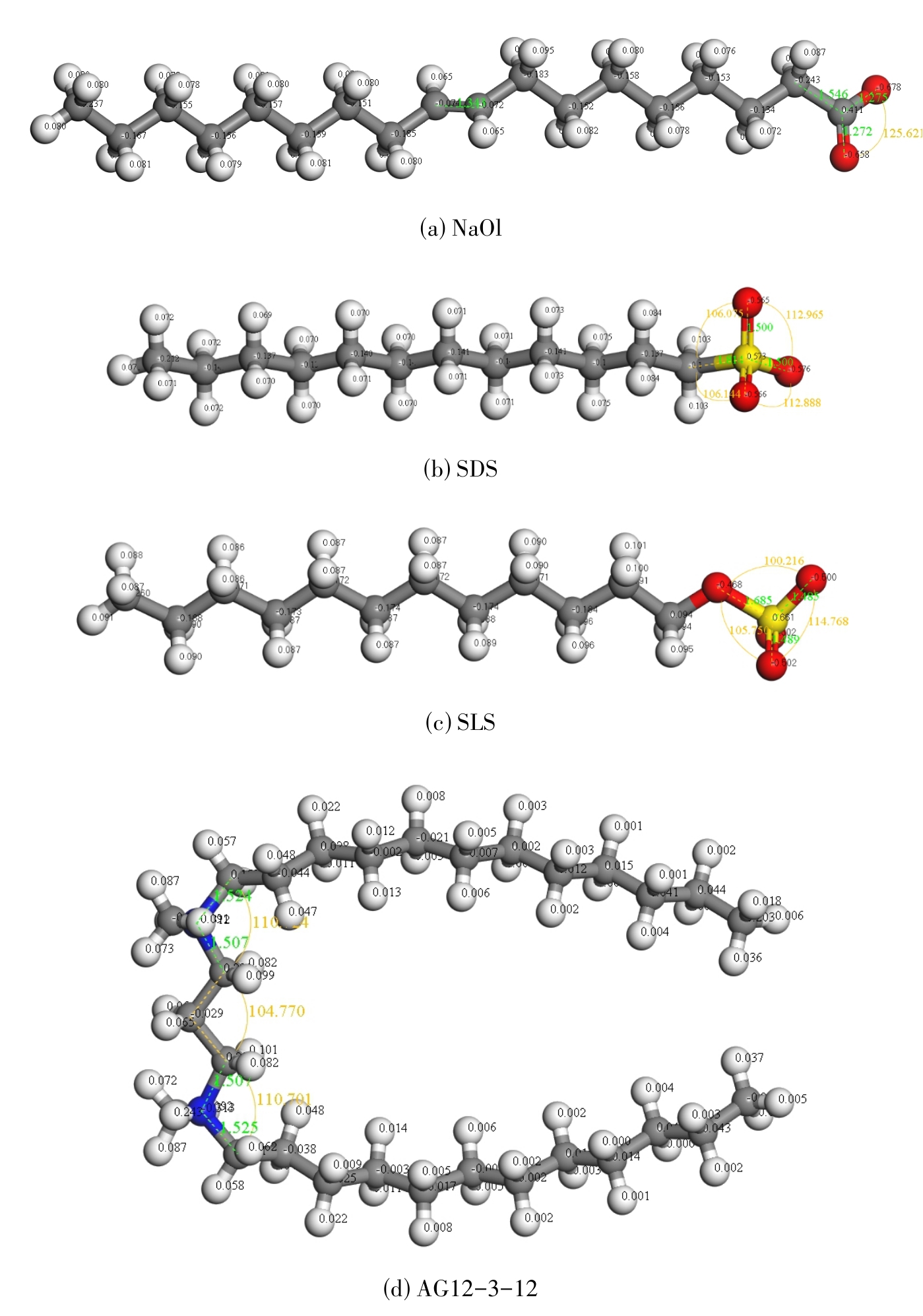 图1 几何优化后表面活性剂的离子结构模型及其原子电荷分布(白色、灰色、蓝色、红色、黄色和绿色球体分别代表氢、碳、氮、氧和硫原子,下同)