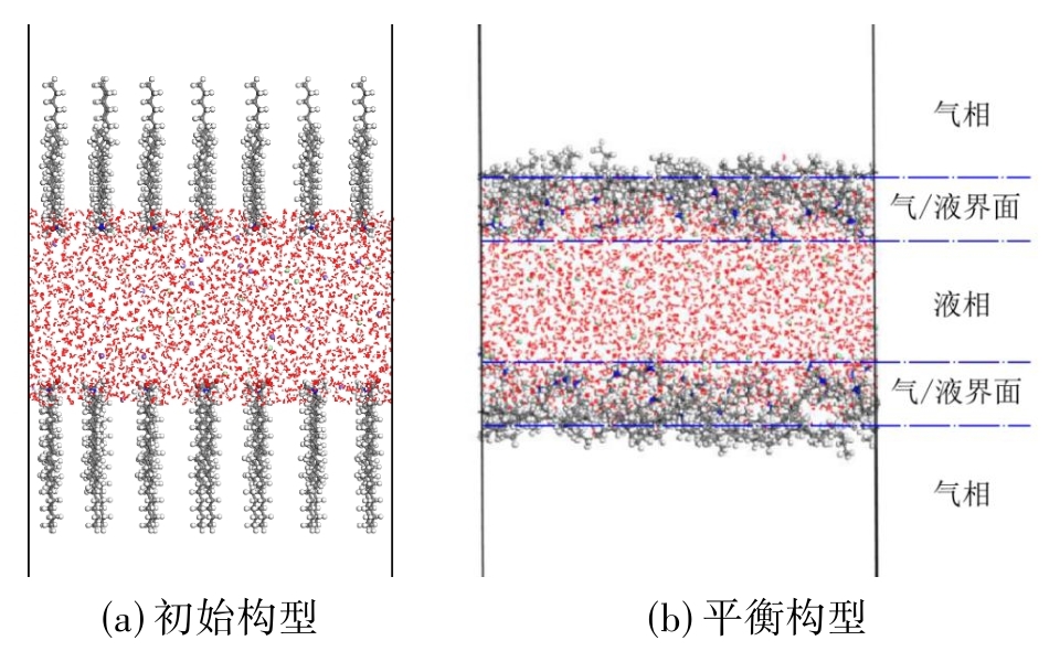 图2 表面活性剂在气/液界面的“三明治”结构模型(为方便观察,水分子以线条样式表示,下同)