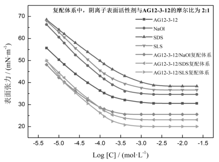 | 表面活性剂种类 | AG12-3-12 | NaOl | SDS | SLS | AG12-3-12/NaOl复配体系 | AG12-3-12/SDS复配体系 | AG12-3-12/SLS复配体系 |