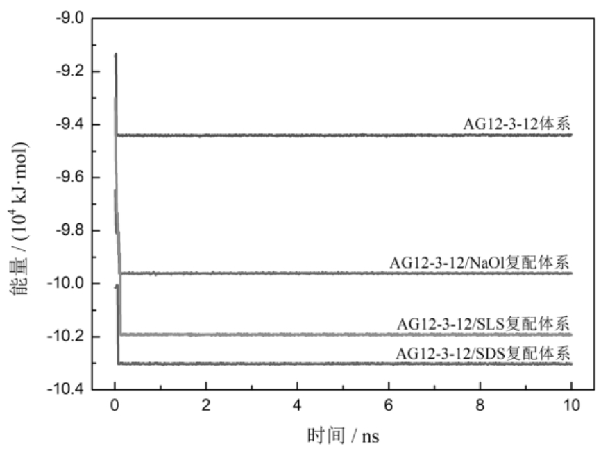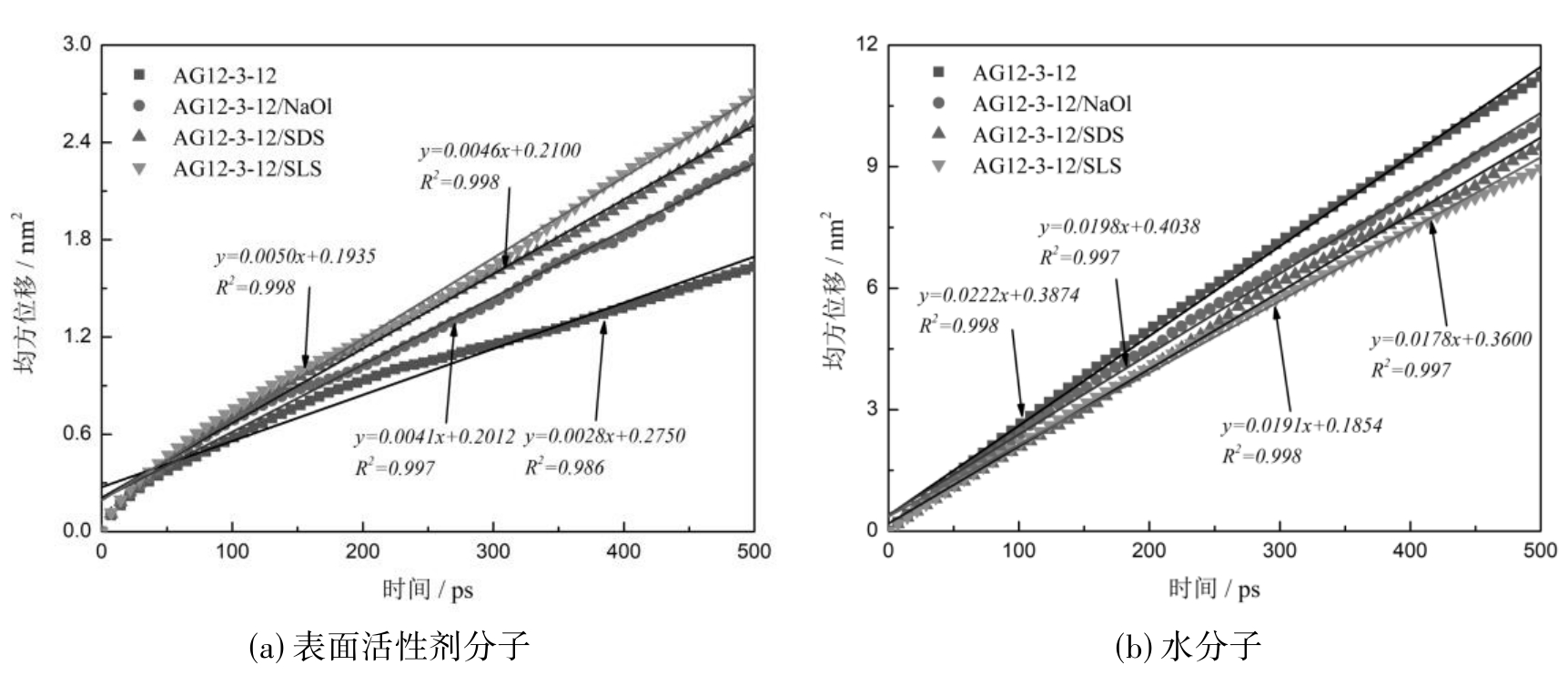 | 扩散系数/(nm2·ps-1) | AG12-3-12 | AG12-3-12/NaOl复配体系 | AG12-3-12/SDS复配体系 | AG12-3-12/SLS复配体系 |