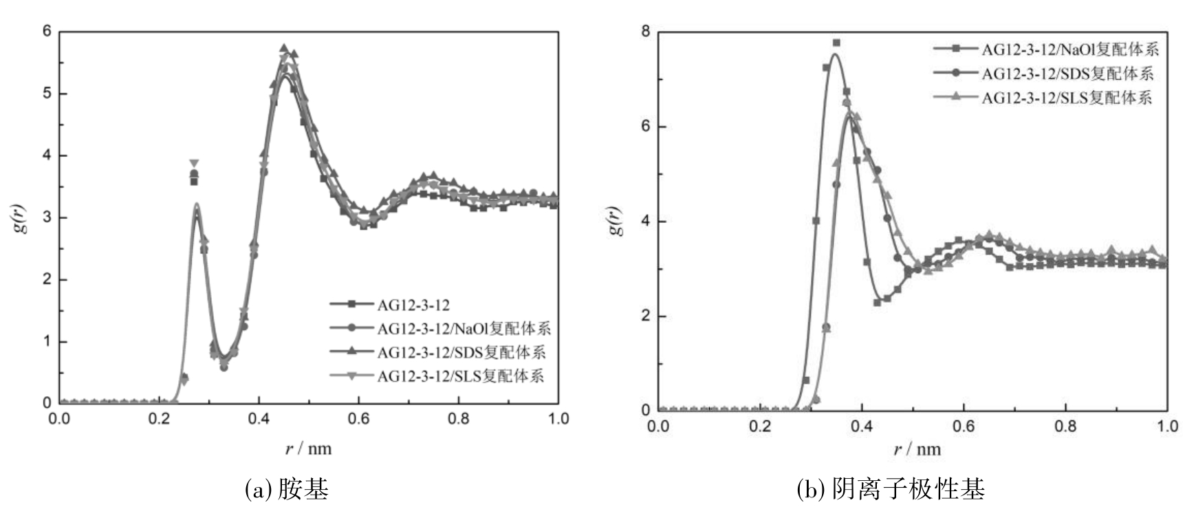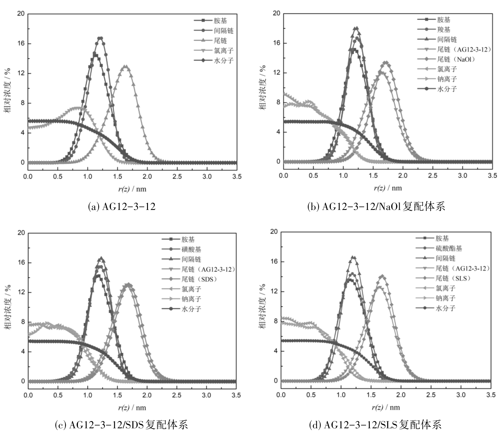 | 水分子配位数/个 | AG12-3-12 | AG12-3-12/NaOl复配体系 | AG12-3-12/SDS复配体系 | AG12-3-12/SLS复配体系 |