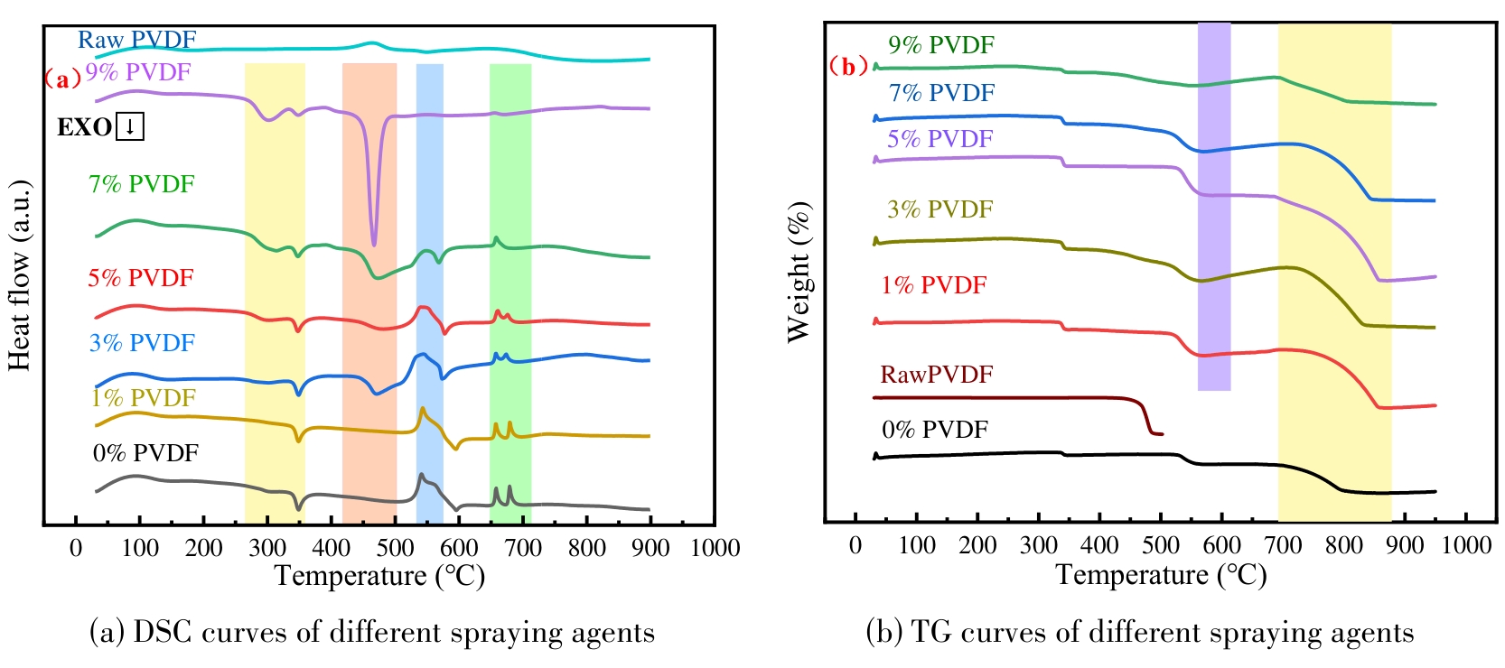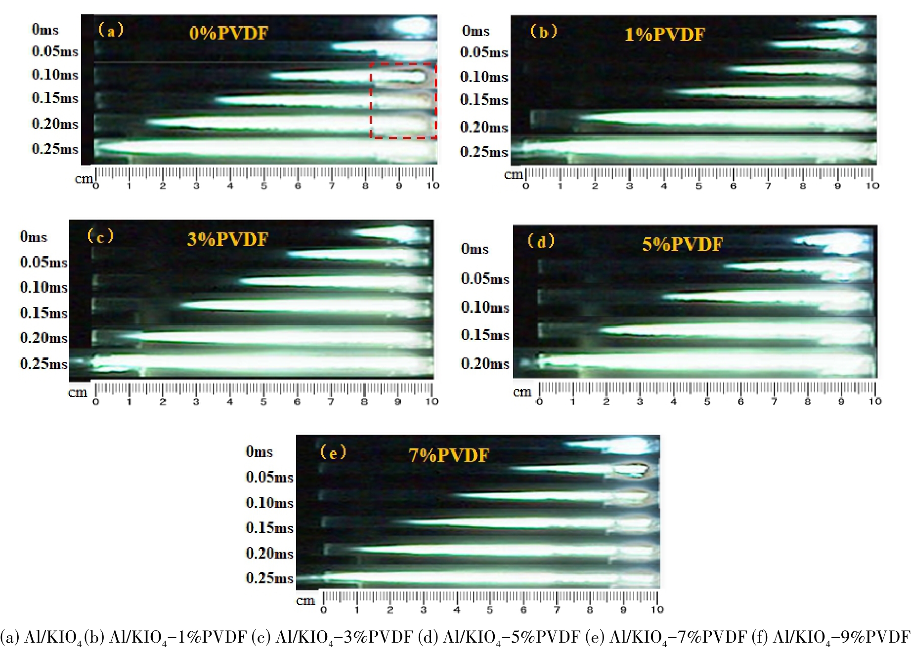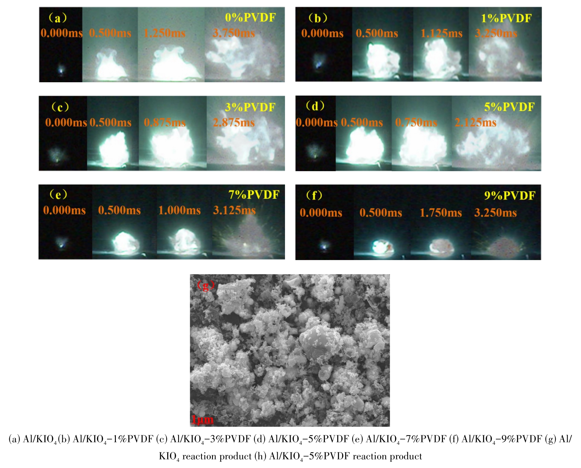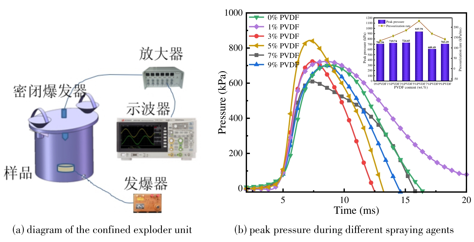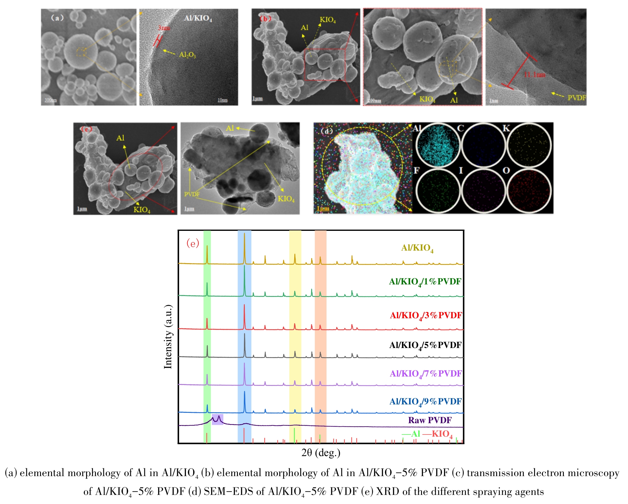 爆炸抛撒干水灭火是一种新型的灭火方式,在不破坏干水材料微观结构的前提下,实现抛撒药剂的高效、均匀扩散,是该领域面临的关键技术挑战之一。本研究使用干水作为灭火剂,以不同质量分数的聚偏氟乙烯 (PVDF) 与Al/KIO4超声混合作为抛撒药剂,通过扫描电镜(SEM)、透射电镜(TEM)、X射线衍射仪(XRD)、能谱分析(EDS)对Al/KIO4-PVDF微观结构进行表征,采用差示量热仪实验、敞开环境下燃烧实验、PMMA管燃烧实验、密闭爆发器实验、静电感度实验对Al/KIO4-PVDF热稳定性、燃速、产气性能和感度测试,并抛撒干水灭火实验。结果表明:PVDF包覆于Al外部亦填充于Al、KIO4间,可调控抛撒药的能量输出,其中Al/KIO4与PVDF质量比为95:5时性能最佳,其燃速、压力峰值、加压速率较Al/KIO4分别提高了44.7%、33.7%、32.5%,该抛撒药剂没有破坏结冷胶干水的核壳结构,抛撒结冷胶干水灭火效率高,750 mg抛撒药剂抛撒500 g结冷胶干水仅65 ms可扑灭20 cm油盘中正庚烷火焰。