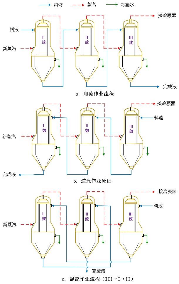顺流 | ①料液借助压力差自流输送无需用泵; ②自蒸发现象增强,蒸发效率高; ③首效浓度低、温度高,有利于杂质析出; | ①末效浓度高、蒸汽温度低,传热效率差; ②首、末效传热系数相差较大,系统整体传热性能不佳; |