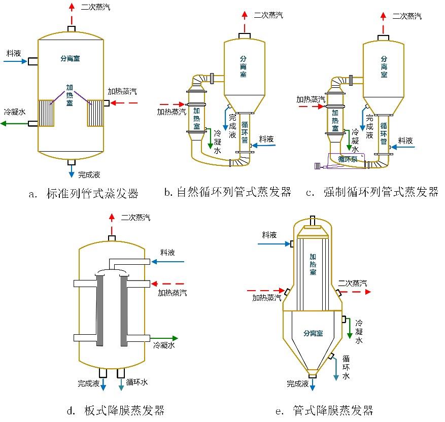 | 标准列管式蒸发器 | 其加热室由垂直管束组成,利用中央循环管和加热管内料液的密度差可使料液作沿粗管下降、沿细管上升的自然循环运动; | 结构简单、制造成本低; | 传热面积受限、传热系数低、汽耗高、不适用于处理结晶性物料; | 传热系数:低 能耗效率:低 |