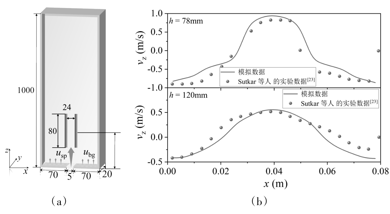 图2 喷动床的结构示意图(a)和模拟结果与实验结果[23]对比图(b)