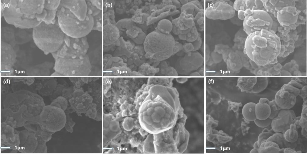 图3 不同包覆量材料的SEM图:(a)NC-1; (b)NC-2; (c)NC-3; (d)NC-4;(e)NC-5;(f)LVP/C注:(d) NC-4; (e) NC-5;(f)LVP/C
