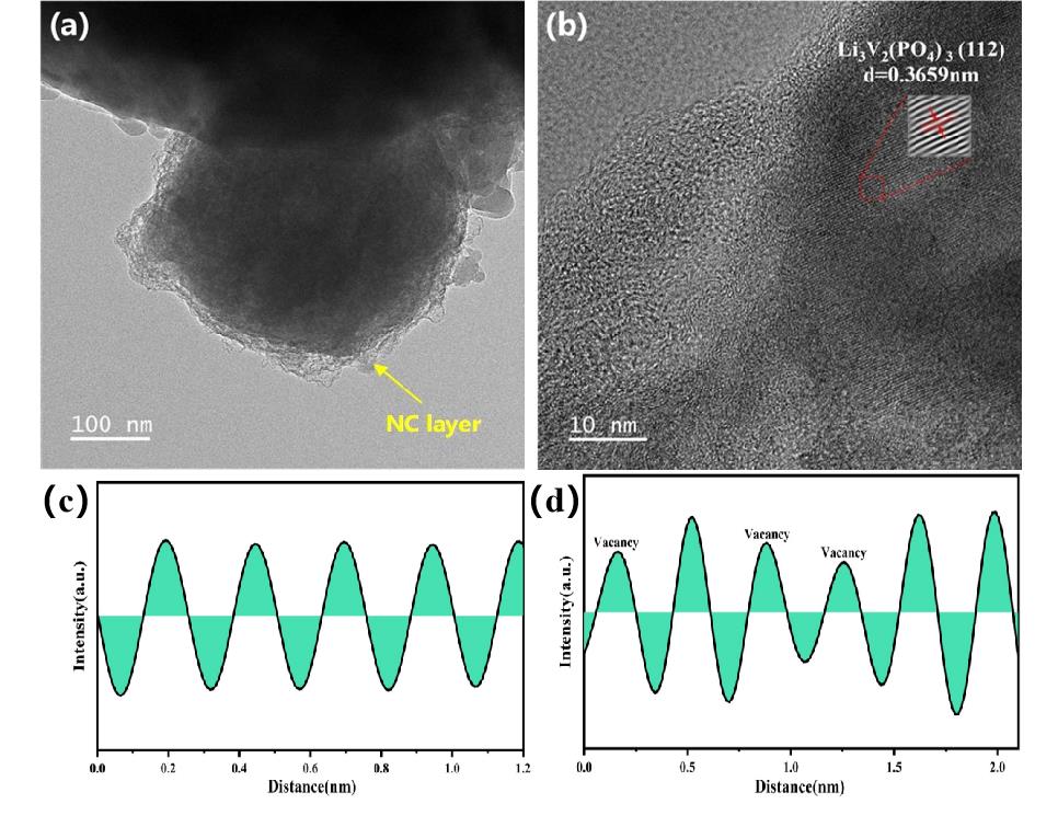 Fig 11 (a), (b) TEM images of LVT0.1P/NC;(c) Lattice stripe intensity curve of LVP/NC; (d) Lattice stripe intensity curve of LVT0.1P/NC