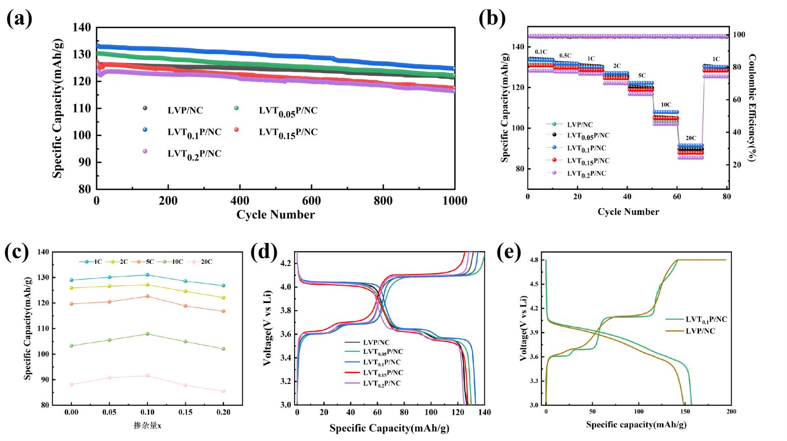 Fig 12 (a) Cycling performance plot of LVTxP/NC (x=0, 0.05, 0.1, 0.15, 0.2) samples at 1C; (b) LVTxP/NC Rate performance plot; (c) LVTxP/NC Capacity trend plotrve; (d) First charge/discharge curve(4.3V); (e)Comparison of Initial Charge-Discharge Curves for LVT0.1P/NC and LVP/NC(4.8V)
